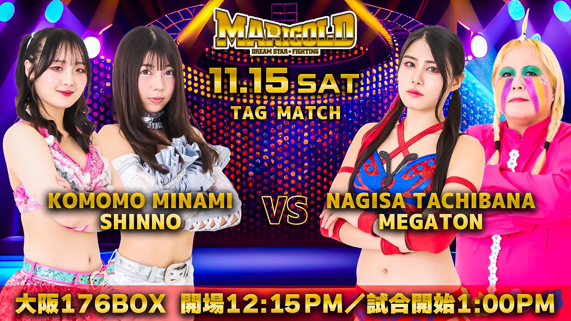>MARIGOLD BATTLE HEART 202511/1 Ushiku Sports Park Gymnasium (VOD 11/4 @ 2:00pm)11/13 Shinjuku FACE (Live @ 6:30pm) 11/15 Osaka 176BOX (1:00pm) (VOD 11/17 @ 2:00pm)11/16 Koka Pro @ Mizuguchi Gymnasium Koka (2:00pm)>Flying Penguin, Hummingbird11/17 Korakuen (Live @ 6:30pm) >MARIGOLD TRUE VICTORY 202511/22 Tohoku Earthquake Memorial Event @ Morioka Gymnasium (1:00pm) (VOD 11/25 @ 4:00pm)11/23 Hamanasu Hall Aomori (1:00pm) 11/24 Kakuno Memorial Sports Center (1:00pm) 11/24 Naniwa Joshi Raising an Army @ MBS Chayamachi Plaza (5:00pm)>Flying Penguin, Kizuna Tanaka, Ryoko Sakimura11/30 Fuka Homecoming @ Nara Centennial Hall (1:00pm) (VOD 12/3 @ 3:00pm)12/6 APA Hotel & Resort Sapporo (11:45am) 12/6 APA Hotel & Resort Sapporo (4:30pm) 12/10 Shinjuku FACE (Live @ 6:30pm) 12/13 Osaka 176BOX (1:00pm) 12/14 Tahara City General Gymnasium (5:00pm) 12/20 Shibuya Sports Center (5:00pm) 12/21 Kamiken Silk Dome Honjo (1:00pm)12/27 Korakuen (Live @ 11:30am)12/31 Shinjuku FACE (Live @ 10:00pm)1/3 Marigold First Dream @ Ota Ward Gymnasium (PPV)>Socialshttps://dsf-marigold.com/jahttps://x.com/DSF_Marigoldhttps://x.com/Marigold_Joshihttps://x.com/hashtag/pw_mghttps://www.instagram.com/dsf_marigold/https://www.youtube.com/@MARIGOLD-ho5nzWatch on Wrestle Universe (¥1,298 per month)https://www.wrestle-universe.com/en/marigold>Entrance musichttps://youtube.com/playlist?list=OLAK5uy_mz1s3xkNlFsMmySZlRdsEkxjj2isTVUEsPrevious >>19183739