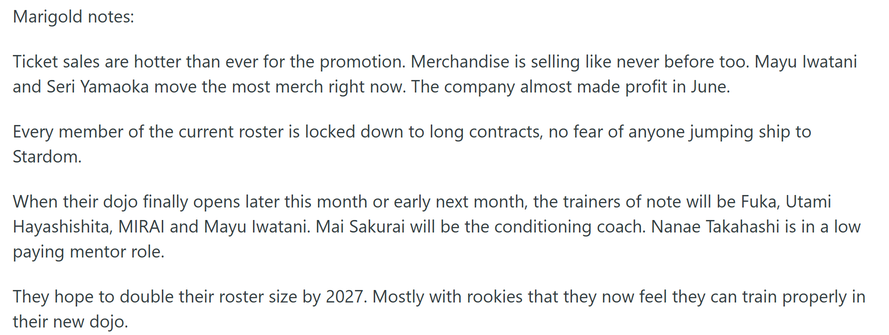 >Mirai "leaves" Marigold>Sareee returns to Marigold>Sareee wants a match with Mayu>Mayu says she doesn't care>Mirai faces Mayu at Michinoku Pro (Marigold partner) in 1st match outside Marigold >Mirai "joins" Michinoku Pro to help start new women's division >Marigold is helping Michinoku Pro to start new women's division>Mirai works Sareee-Ism in 2nd match outside Marigold>Which Sareee (who wants the Mayu match) booksIt's a work