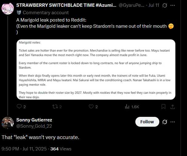 >>19205709>>19205718>>19205737samefag he doesn't even watch Marigold anymore he's a CMLL and STARDOM chad. He loves Saya Kamitani.