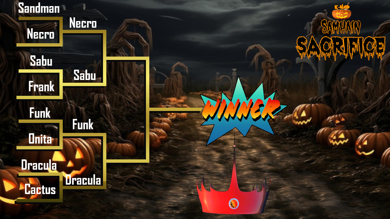 Alright, here's the progress of our Crimson Crown deathmatch tournament so far. It's all come down to Count Dracula and The MAGA Butcher, and they will settle it in the craziest deathmatch that K-WAB wrestling has ever done. We will now take a short 15-minute intermission before resuming with the show