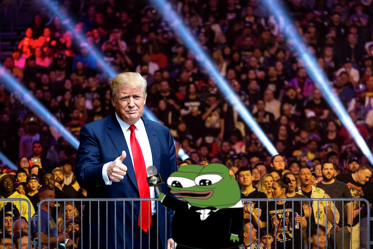 Hello everyone, it's your fren, Frenly Apu, and we have a very special guest in the crowd tonight! I have the honor of introducing the 45th and 47th President of the United States, Donald J. Trump!>Thank you, thank you...it's an honor to be here, I just want to say I love what my good friend Pepe Von Erich is doing here. He's a classy guy like me, and he's also ridiculously rich like me, and I know that because he paid to fly me all the way out here to this god-forsaken hellhole full of vampires and zombies and werewolves and what not. But that's ok, the secret service is having a lot of fun, they always wanted to play "House of the Dead" in real life, and they're having an absolute blast. This show is huge, it's the biggest, the grandest, the most amazing spectacle in the history of all amazing spectacles, just like me and my glorious presidency. Keep it up boys, and maybe...just maybe...you can make professional wrestling great again.