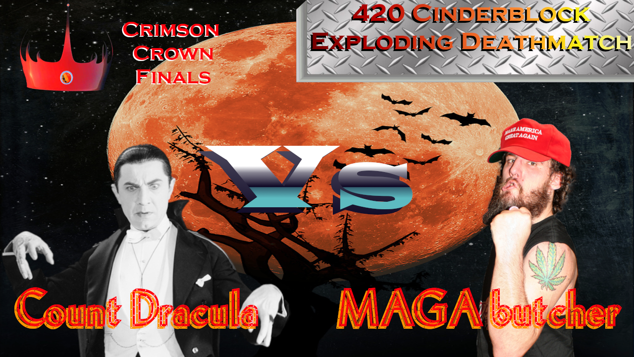 Alright ladies and gentlemen, here it is! The finals of our Crimson Crown tournament, and this will be a 420-CINDERBLOCK BARBED WIRE EXPLODING TIMEBOMB DEATHMATCH!!!!!!!!!! We pulled out all the KINO for this one because this one is for the Crimson Crown! And now I give you: Count Dracula Vs The MAGA Butcher!https://www.bitchute.com/video/c3uyzH2LiImG