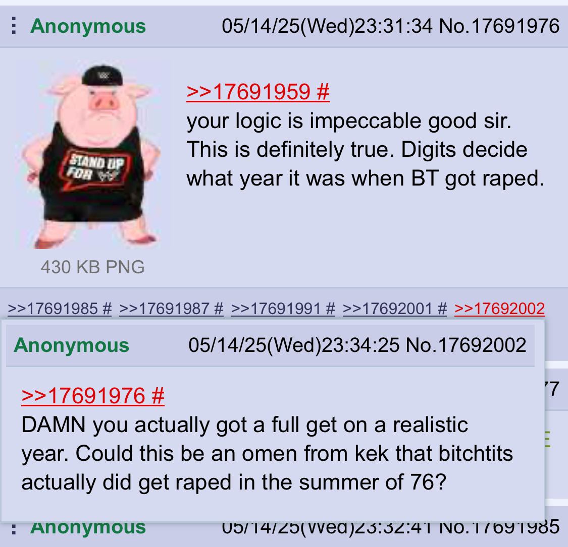>>19208976absolutely based. and it fits because bitchtits was raped in the year of 1976 as confirmed many times. and we also know he's a troon because he posted that infamous buttista pic