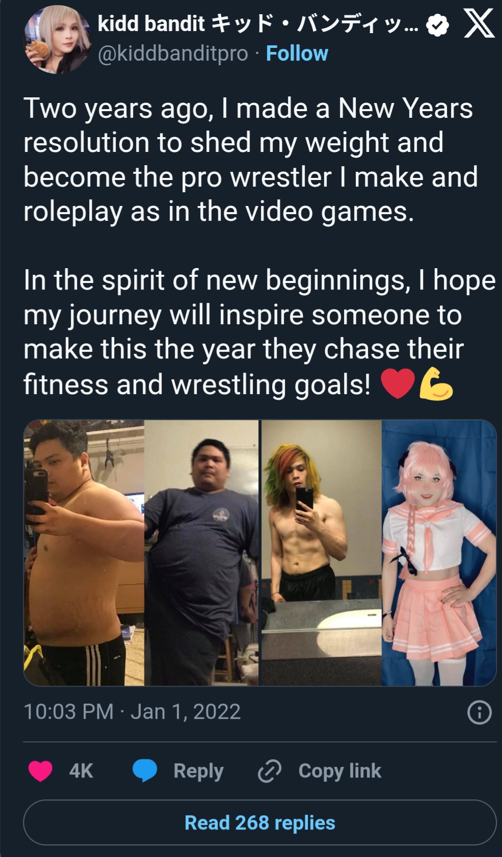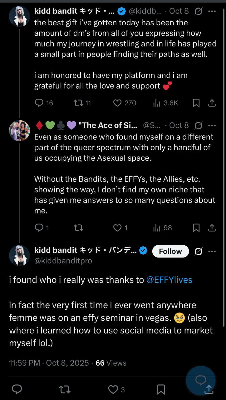 he's posted about how Effy got him in touch with his gender identity and made him realize he was a trannydon't think he realized it was basically him admitting to being brainwashed with fag propaganda from a wrestler he looked up to who uses his swing politically to get people booked or not on indies.