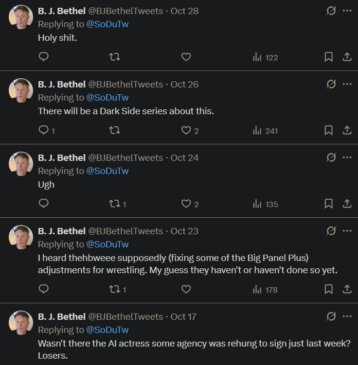 >>19225884>BJ Bethel - a 50+ year-old man with the critical thinking skills and tastes of a child who was known for covering high school football in the 6th biggest city in a flyover state and was unable to hold a consistent job as a blogger for several local media outlets - is a real journalist who definitely has contacts in global media companies who won't give the numbers to anyone but him.This is what AEWtists unironically believe