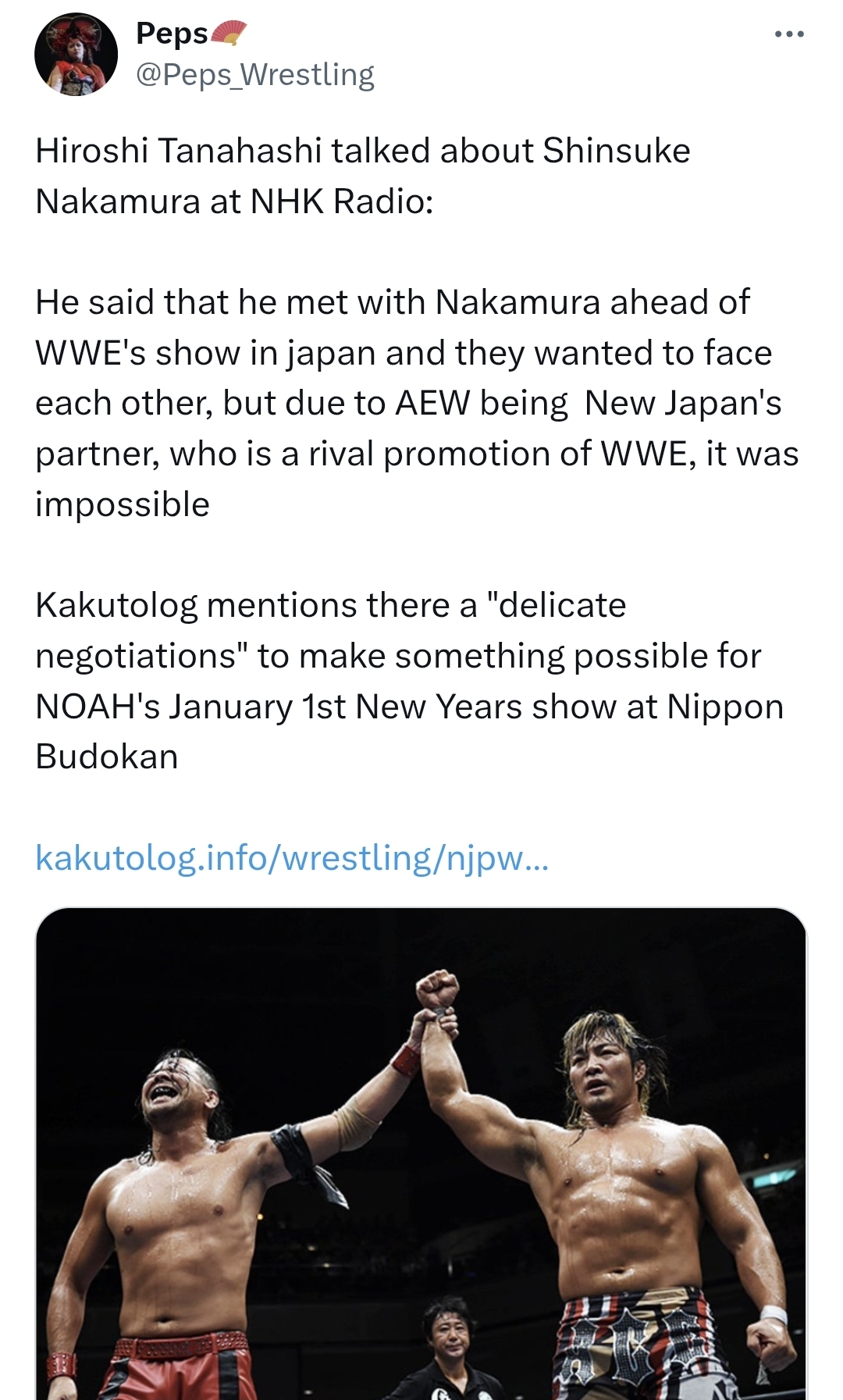>>19253843Yeah looks like NOAH clearly veto'd the nakamura tanahashi match because they want it on their New Year's show instead to try to draw for themsad