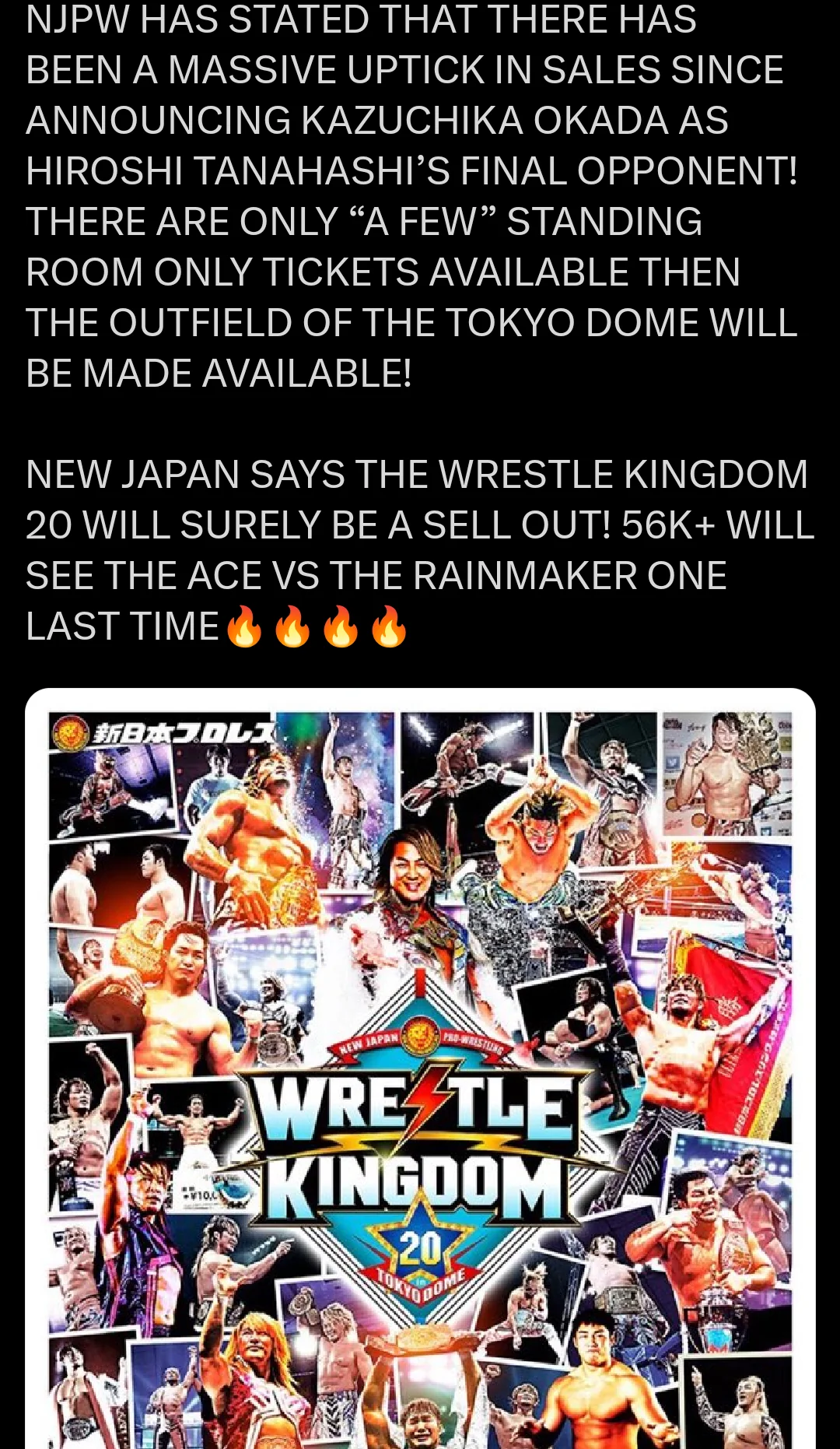 If you think about it, Okada might be the most manufactured star in New Japan's history. He was never able to draw by himself at the Tokyo Dome.>WK7: Tanahashi was the draw>WK8: people talk about Naito failing but Okada was the world champ and got relegated to the semi-main.>WK9: Tanahashi was the draw>WK10: Tanahashi was the draw and heavily carried his ass>WK11: Naito vs Tanahashi in the semi-main was the draw but they didn't want to humiliate Okada by making fans vote>WK12: Naito was the draw, crowd was killed when Okada won>WK13: Tanahashi and Naito vs Jericho drew the house meanwhile Okada wasn't even in the semi-main and no one cared about him facing Jay White anyway>WK14: Naito's story and Ibushi's autism drew the house.>WK17: Antonio Inoki's death was literally carrying this cough era WK real hard.>WK20: Tanahashi carries Okada's ass again, his retirement is the draw