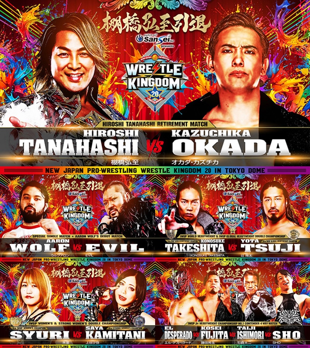 >>19248922>Road to TOKYO DOME12/19 G Messe Gunma (6:30pm) 12/21 Light Cube Utsunomiya (5:00pm) 12/22 Korakuen (6:30pm)1/4 Wrestle Kingdom 20 @ Tokyo Dome (4:00pm)>IWGP World Heavyweight & IWGP Global Heavyweight Double Championship Match: Konosuke Takeshita (c) vs Yota Tsuji (c) [14th World champion, 6th Global champion, 2nd defense each]>Hiroshi Tanahashi Retirement Match: Hiroshi Tanahashi vs Kazuchika Okada>Aaron Wolf Debut & NEVER Openweight Championship Match: King of Darkness EVIL (c) vs Aaron Wolf [49th champion, 1st defense]>IWGP Women’s & STRONG Women’s Double Championship Match: Syuri (c) vs Saya Kamitani (c) [6th IWGP Women’s champion, 6th STRONG Women’s champion, 1st and 2nd defenses]>IWGP Jr. Heavyweight Championship No. 1 Contender 4 Way: El Desperado vs Taiji Ishimori vs Kosei Fujita vs SHO1/5 New Year Dash!! @ Ota Ward Gymnasium (6:30pm)