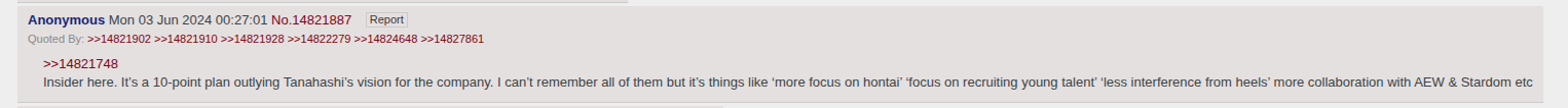 >>19273629>Be Tony Khan>See (>>19248966)>Use Media stooges to not so subtly call Tanahashi a liar Yappari, what a great partnership!