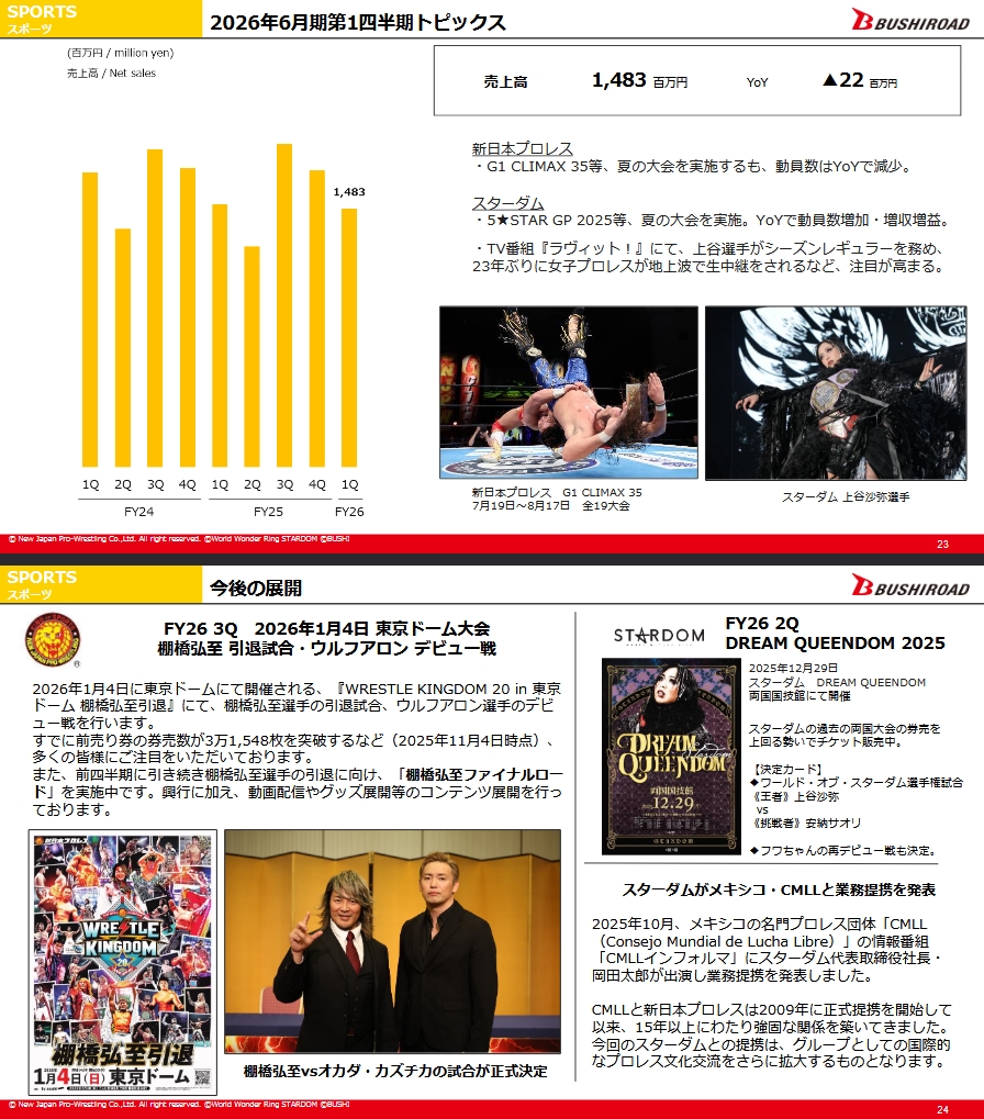 >[Sports Division] Net Sales: 1,483 million yen (YoY: -22 million yen)>NJPW (New Japan Pro-Wrestling): Despite holding summer events such as G1 CLIMAX 35, attendance decreased YoY.>STARDOM: Held summer events such as 5STAR GP 2025. Attendance increased YoY, resulting in higher revenue and profit. Wrestler Saya Kamitani served as a seasonal regular on the TV program “Love it!”. Women’s professional wrestling was broadcast live on terrestrial television for the first time in 23 years, increasing public attention>FY26 Q3 – January 4, 2026 Tokyo Dome Event: Hiroshi Tanahashi Retirement Match / Aaron Wolf Debut Match>At “WRESTLE KINGDOM 20 in Tokyo Dome: Hiroshi Tanahashi Retirement” on January 4, 2026, Hiroshi Tanahashi will compete in his retirement match, and Aaron Wolf will wrestle his debut match.>As of November 4, 2025, advance ticket sales have already surpassed 31,548 tickets, showing significant public interest.>In addition, following the previous quarter, the “Hiroshi Tanahashi Final Road” campaign continues leading up to his retirement. Alongside live events, related content such as video distribution and merchandise expansion is ongoing.