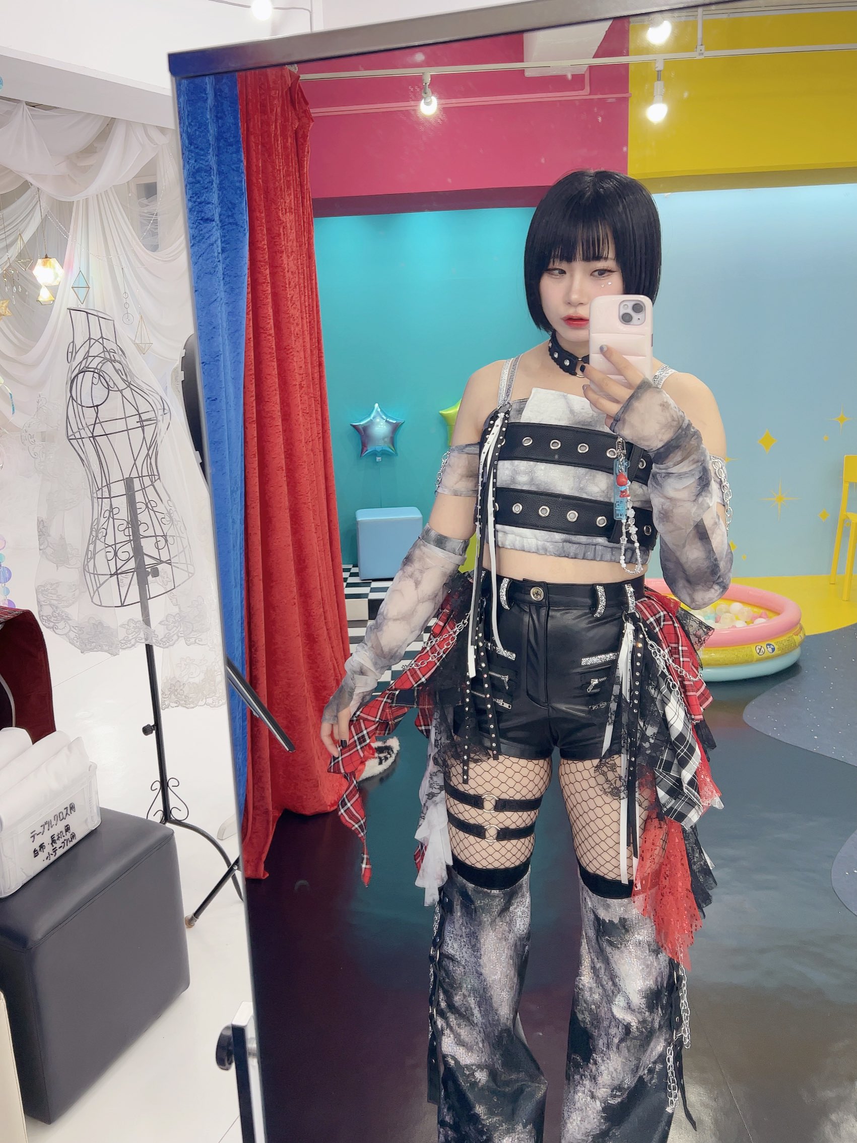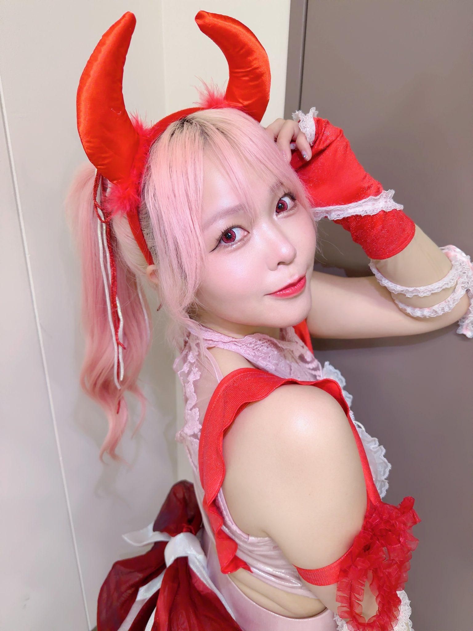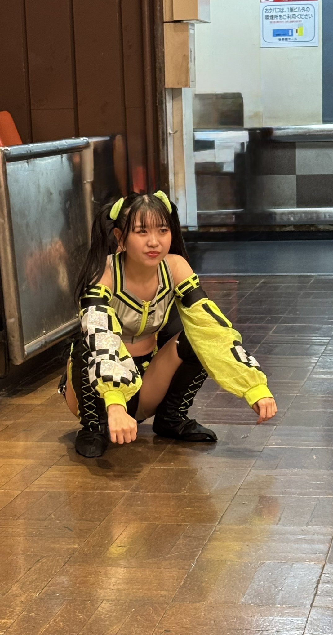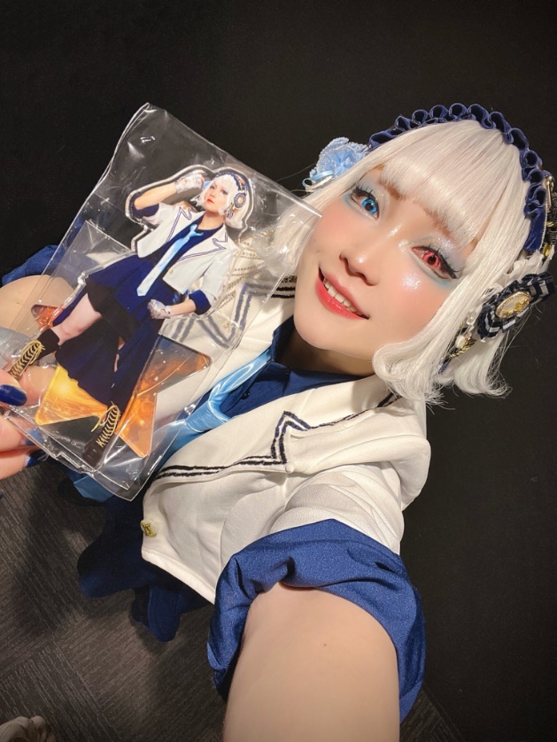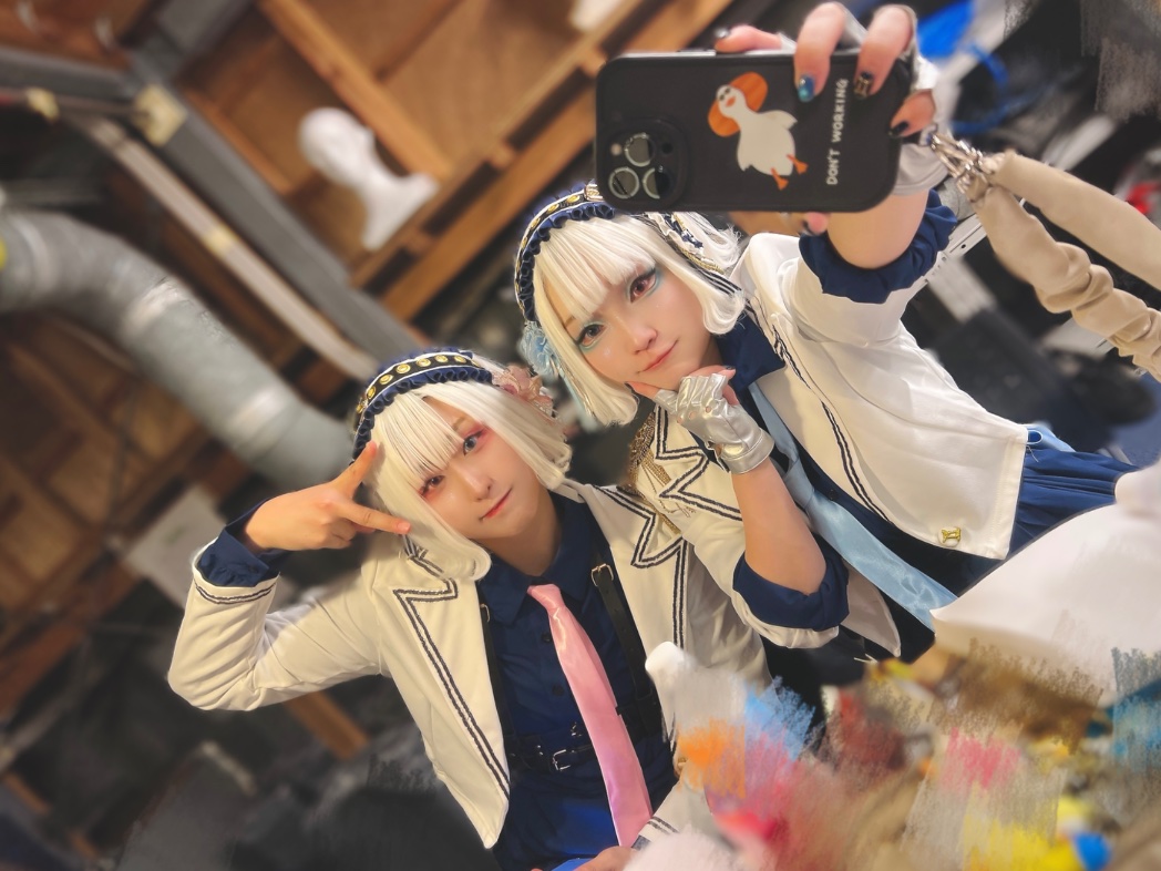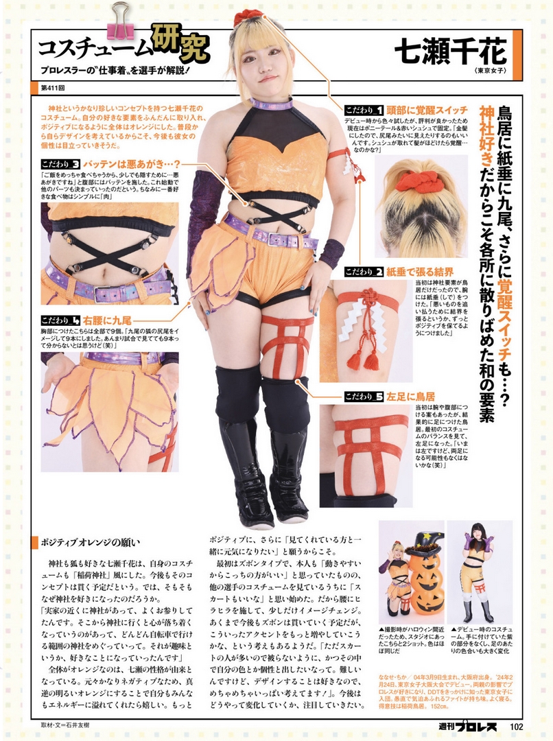 >Chika Nanase, who likes shrines and foxes, styled her own costume after an Inari shrine. She plans to stick with that concept going forward. But why did she come to like shrines in the first place? “There was a shrine near my parents’ house and I used to visit it a lot. Going to shrines calmed me down, so I started visiting every shrine I could reach by bicycle. It became a hobby—or something I really liked.” The overall orange color comes from Nanase’s personality. She’s naturally quite negative, so by choosing the complete opposite—bright orange—she hoped both she and everyone else would feel energized. She wants to be more positive and, even more, “to get cheerful together with the people watching me.” At first the costume was a pants style, and she thought, “This is better because it’s easy to move in.” But after seeing other performers’ outfits she began to think, “A skirt would be nice too.” So she added a sash at the hips for a slight image change. She still plans to keep pants as her main style, but she’s thinking about adding more accents like this. “Since many people wear skirts, I don’t want to be the same as everyone else—I want to show my own color and personality. It’s difficult, but I love designing, so I’ve been thinking about it a ton!” It’ll be interesting to see how her look evolves from here.>Detail 1: Awakening Switch on the Head>Since her debut, she’s tried various hairstyles, but she’s now settled on a ponytail with a red scrunchie, since it received good feedback. “I dyed my hair blonde, so it kind of looks like a tail — which I like. And if the scrunchie comes off and my hair loosens… maybe that’s my awakening mode?”>Detail 2: Warding Barrier with Paper StreamersAt first, her costume only had faint shrine elements, so she added paper streamers (shide) to it. “They act like a barrier to ward off evil — I put them on so I can stay positive all the time.”
