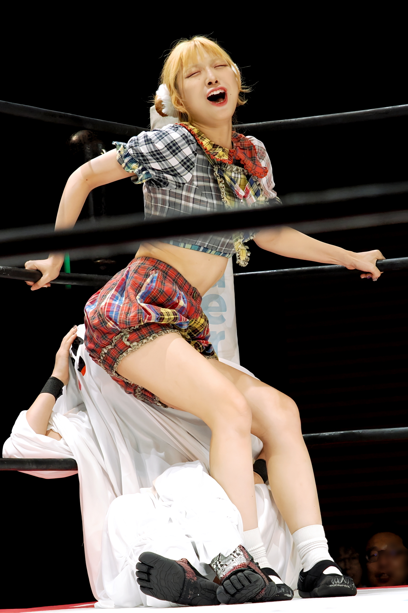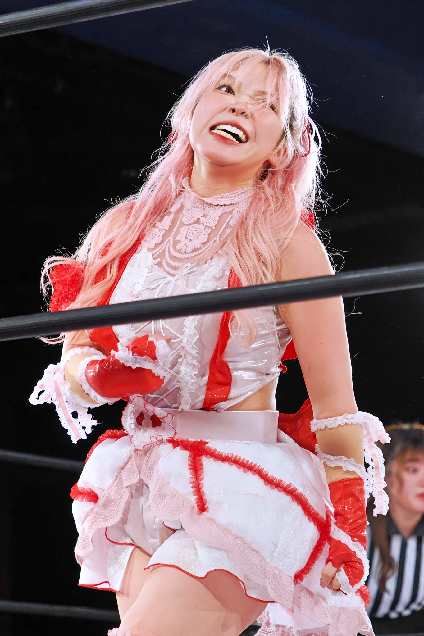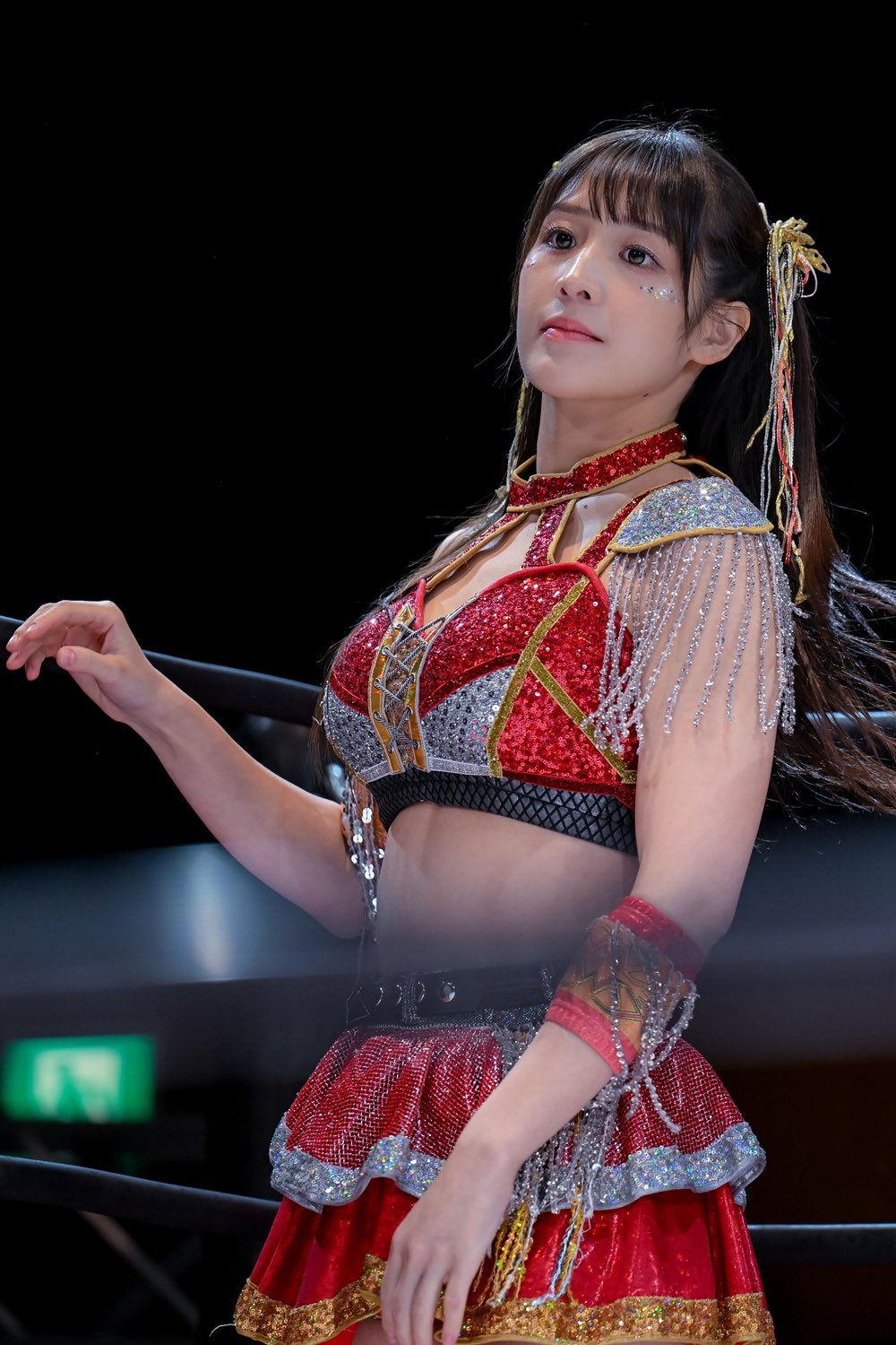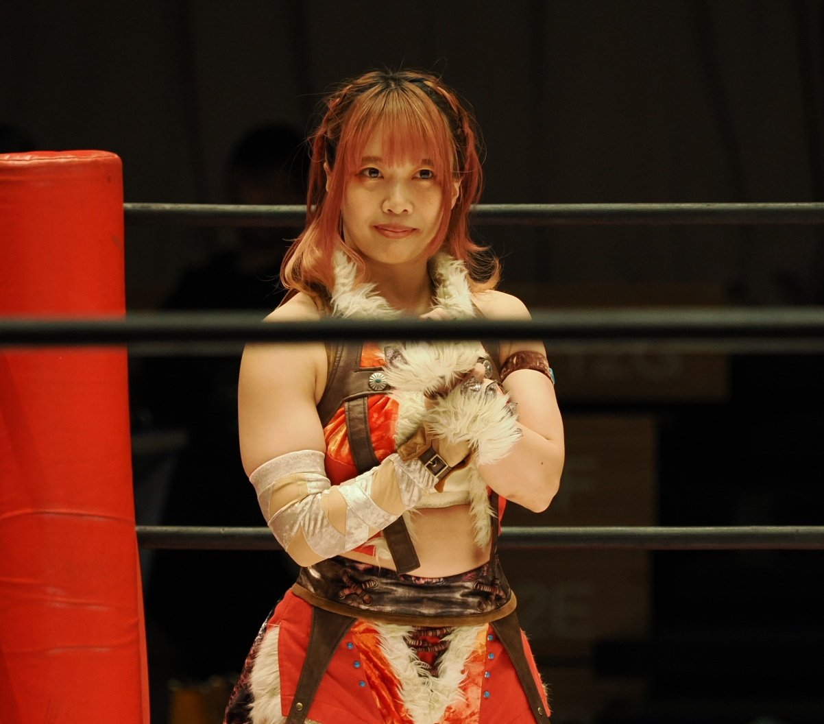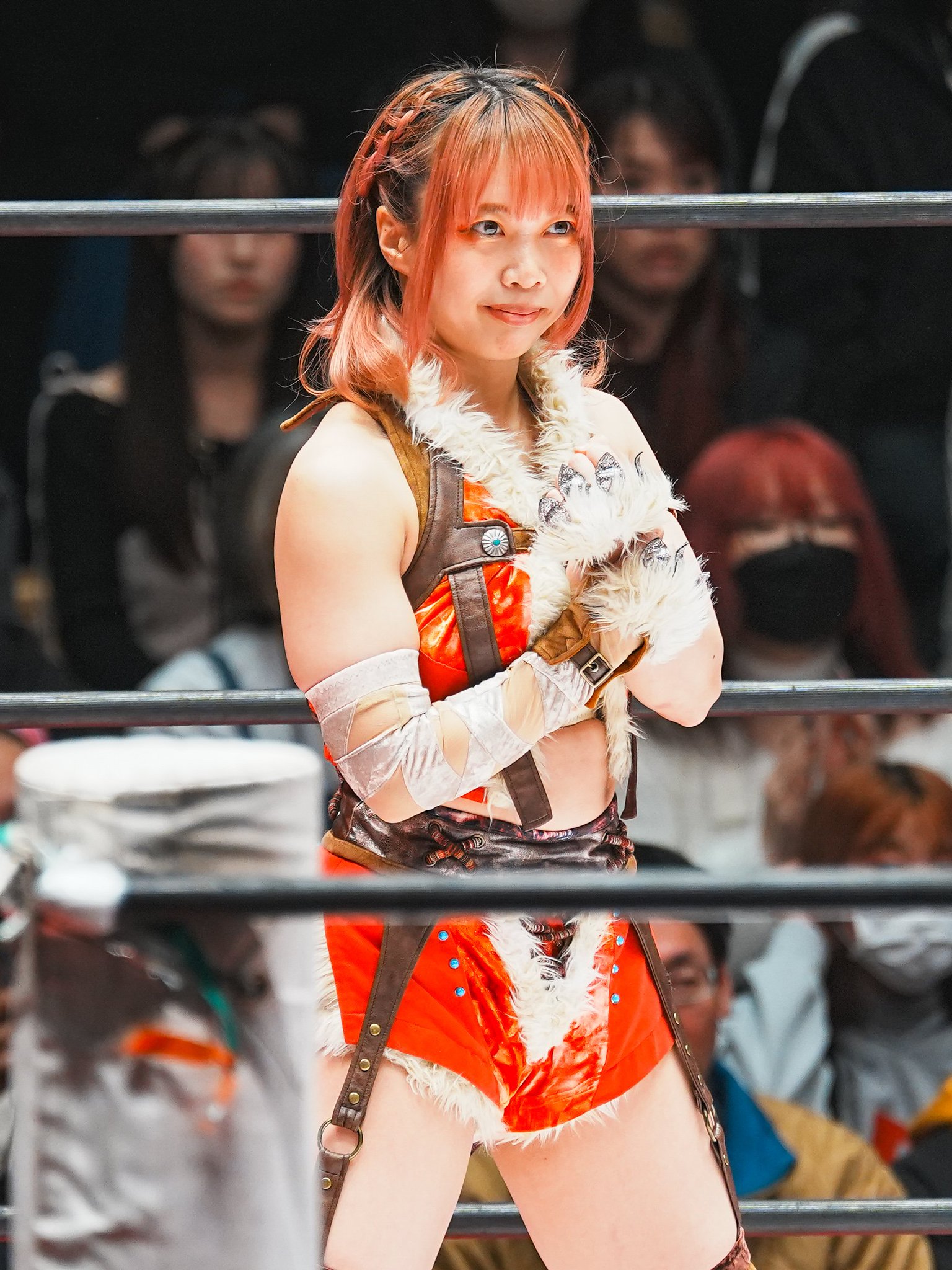 >>19249482>Detail 3: The “X” as a Desperate Move?>“I tend to eat a lot, so the X on my stomach is kind of a desperate attempt to hide it,” she laughs. That X actually became the starting point for deciding the rest of the design. By the way, her favorite food is simply "meat".>Detail 4: Nine Tails on the Right Hip>The nine ornaments attached to her chest represent the tails of the nine-tailed fox. “I designed them to look like nine tails of a fox spirit. You probably can’t really tell it’s nine during a match though, haha.”>Detail 5: Torii Gate on the Left Leg>At first, she considered placing the torii gate motif on her chest or stomach, but after balancing the design of the original costume, it ended up on her left leg. “It’s on the left for now, but maybe someday I’ll have them on both legs, haha.”