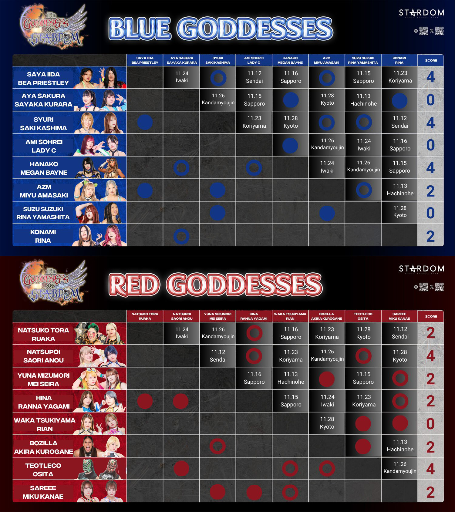 November 12th, "15th Goddesses of Stardom Tag League in SENDAI", Sendai PIT, Miyagi, 6:30PM JST (LIVE)>AZM (NEO GENESIS), Aya Sakura & Sayaka Kurara (COSMIC ANGELS) & Kikyo Furusawa (-) vs Suzu Suzuki, Rina Yamashita, Bozilla & Akira Kurogane (Mi Vida Loca)>Miyu Amasaki (NEO GENESIS) vs Waka Tsukiyama (E neXus V) vs Saya Kamitani (H.A.T.E.)>HANAKO & Rian (E neXus V) vs Momo Kohgo (STARS) & Ranna Yagami (God's Eye)>Blue Goddess: Anecon (Syuri & Saki Kashima vs Konami & Rina (New*Sisters)>Blue Goddess: Saya Iida & Bea Priestley (Gorilla Trigger) vs Ami Sohrei & Lady C (Reiwa Tokyo Towers)>Red Goddess: Natsupoi & Saori Anou (Natsu & Saory) vs Yuna Mizumori & Mei Seira (Suisei)>Red Goddess: Natsuko Tora & Ruaka (BMI2000) vs Sareee (Freelance & Miku Kanae (T-HEARTS)November 13th, "15th Goddesses of Stardom Tag League in HACHINOHE", Aomori, U-Tree 1st floor multipurpose large hall, 7:00PM JST (LIVE)>HANAKO (E neXus V) vs Ema Maishima (-)>Saya Iida, Momo Kohgo & Bea Priestley (STARS) vs Ami Sohrei, Lady C & Ranna Yagami (God's Eye) vs Saya Kamitani, Natsuko Tora & Ruaka (H.A.T.E.)>Blue Goddess: AZM & Miyu Amasaki (02line) vs Konami & Rina (New*Sisters)>Blue Goddess: Aya Sakura & Sayaka Kurara (Sakurara) vs Suzu Suzuki & Rina Yamashita (Ossu! Blood-Soaked Women’s Academy)>Red Goddess: Bozilla & Akira Kurogane (Mi Vida Loca) vs Sareee (Freelance) & Miku Kanae (T-HEARTS)>Red Goddess: Yuna Mizumori & Mei Seira (Suisei) vs Waka Tsukiyama & Rian (Reckless Fantasy)November 14th, [LLPW-X] "Hono Emaki Vol. 4 Kandori Rice Harvest Festival", Kanda Myojin Hall, Tokyo, 7:00PM JST>Shinobu Kandori (LLPW-X), NORI LLPW-X) & Miyuki Takase (Sendai Girls) vs. Megumi Yabushita (Freelance), Bozilla (STARDOM/Mi Vida Loca) & Akira Kurogane (STARDOM/Mi Vida Loca)>Rest of card: https://llpw-x.com/hounouemaki4/Previous >>19249622