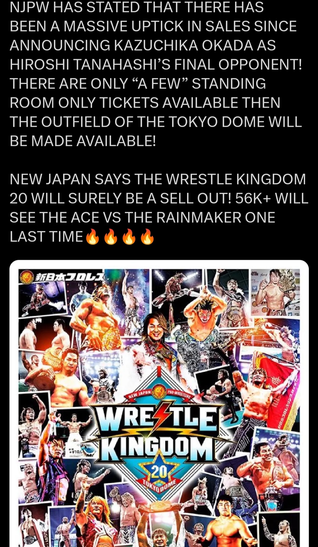 >Breaking news!! A report from the front lines: The ticket sales for the 1.4 New Japan Pro-Wrestling Tokyo Dome event and the 12.29 STARDOM Ryogoku event are insanely hot.