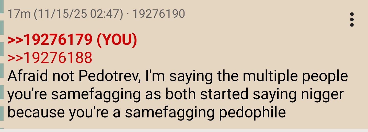 >>19276179>>19276188Afraid not Pedotrev, I'm saying the multiple people you're samefagging as both started saying nigger because you're a samefagging pedophile