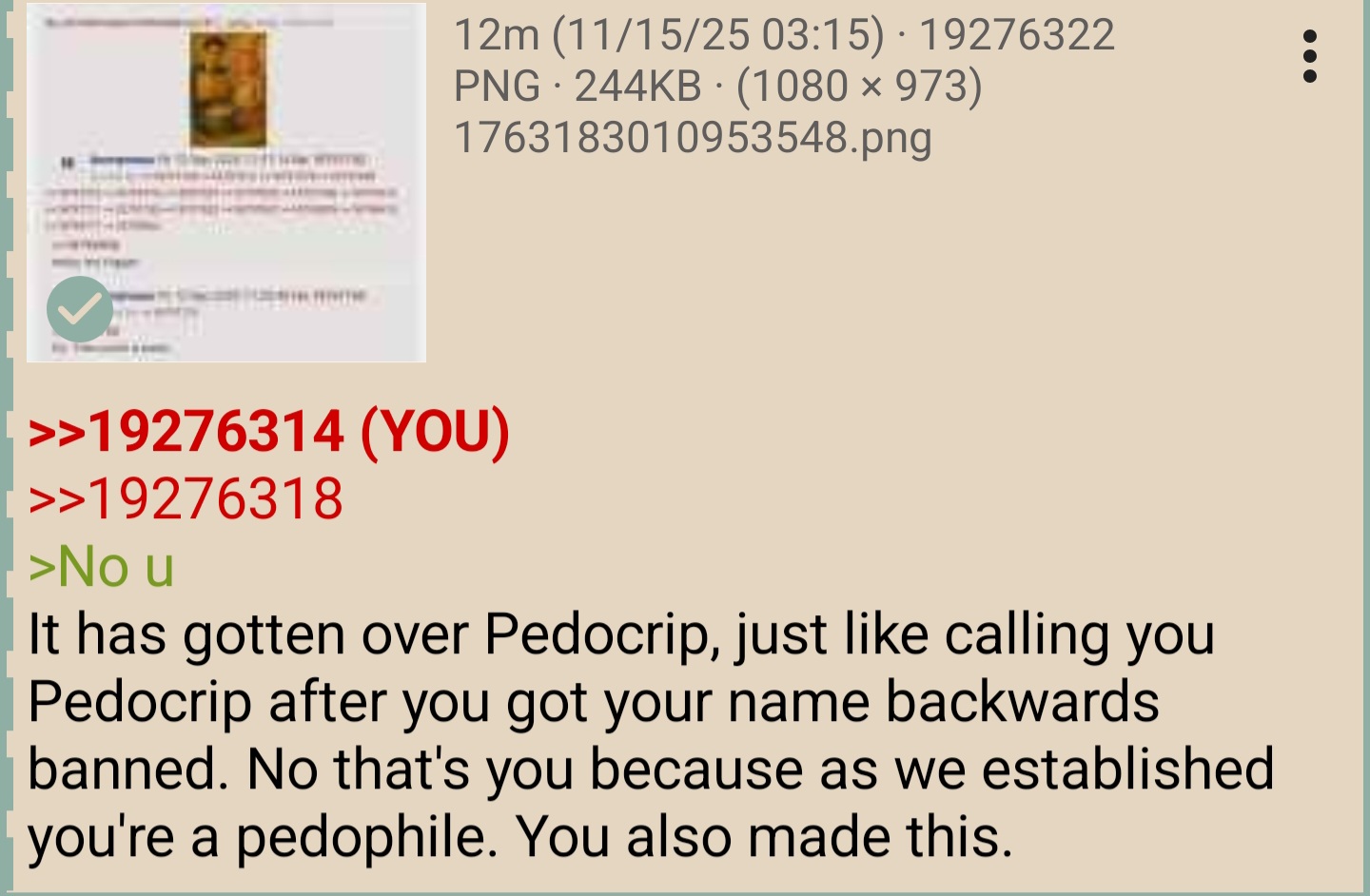 >>19276314>>19276318>No uIt has gotten over Pedocrip, just like calling you Pedocrip after you got your name backwards banned. No that's you because as we established you're a pedophile. You also made this.