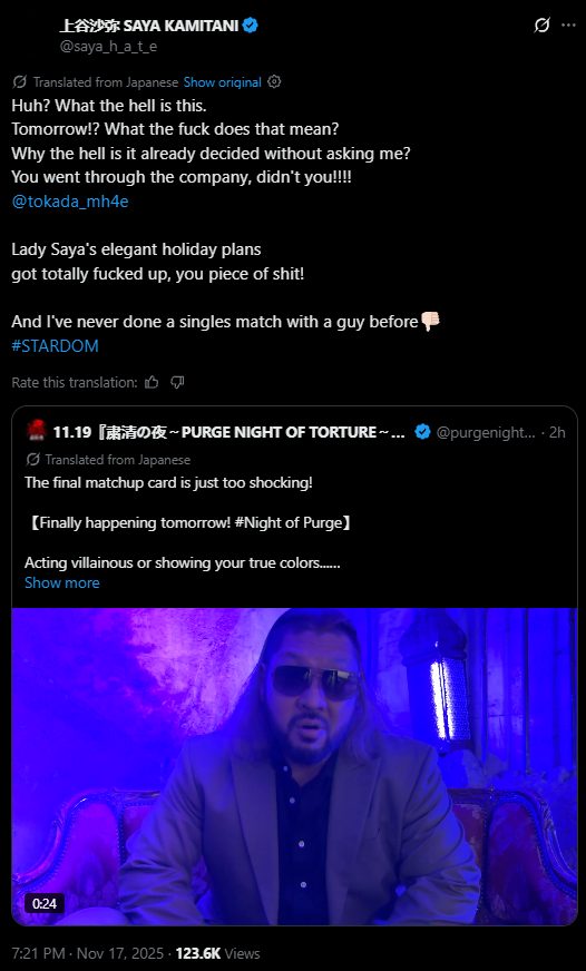 >Huh? What the hell is this.>Tomorrow!? What the fuck does that mean?>Why the hell is it already decided without asking me?>You went through the company, didn't you!!!! >@tokada_mh4e >Lady Saya's elegant holiday plans got totally fucked up, you piece of shit!>And I've never done a singles match with a guy before>#STARDOM