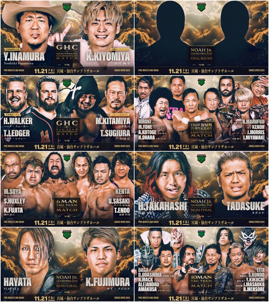 >>19304558>NOAH11/21 Cross Over 2025 @ Sendai Sunplaza Hall (6:30pm)>GHC Heavyweight Championship: Yoshiki Inamura vs Kaito Kiyomiya>NOAH Jr. GRAND PRIX Final: (Winner of Hiromu Takahashi vs Tadasuke) vs (Winner of HAYATA vs Kai Fujimura)>GHC Tag Team Championship: Hank Walker & Tank Ledger (c) Masa Kitamiya & Takashi Sugiura>Hi69 Comeback Match & 25th Anniversary Match: Hi69, Muhammad Yone, Atsushi Kotoge, & Hajime Ohara vs Naomichi Marufuji, Kenoh, Jack Morris, & Junta Miyawaki>Manabu Soya, Saxon Huxley, & Kazuyuki Fujita vs KENTA, Ulka Sasaki, & Tetsuya Endo>NOAH Jr. GRAND PRIX Semi Final: Hiromu Takahashi vs Tadasuke>NOAH Jr. GRAND PRIX Semi Final: HAYATA vs Kai Fujimura>Daga, Daiki Odashima, Ninja Mack, Alejandro, & AMAKUSA vs Eita, Shuji Kondo, Yuto Kikuchi, Jun Masaoka, & Black Mensore