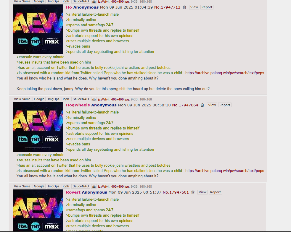 >>19400601>I really really REALLY don't want that FUCKING Dynashit ratings thread bumped 300 times>I know, I'll shop some gay porn and frame "BT" for doing it>then I'll accuse every single person who laughs at AEW for the next week of being the culpritSuch a sad sack of shit, imagine being lowered to this point