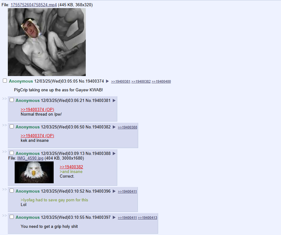 >>19400764>continued breakdown and descent into madnessYou photoshopped gay porn of a Twitter troll who raped your mind years and posted it on 4chan looking for approval. Yesterday at 4am in the morning you spammed 25 threads about that same guy onto teh catalog in a 45 minute span, in what can only be described as a manic fit.I don't need to say anything further than simply listing your own actions back to you.Those thing I just listed are a "continued breakdown and descent into madness."