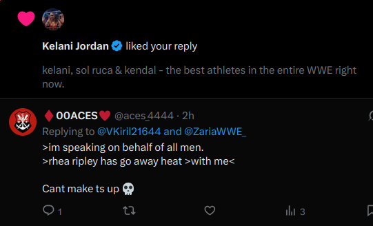 kelani jordan - does not know what 4chan issol ruca - does not know what 4chan isharley cameron - "oh its the joke website"rhea ripley - known for frequently browsing 4chan, samefagging & melting down