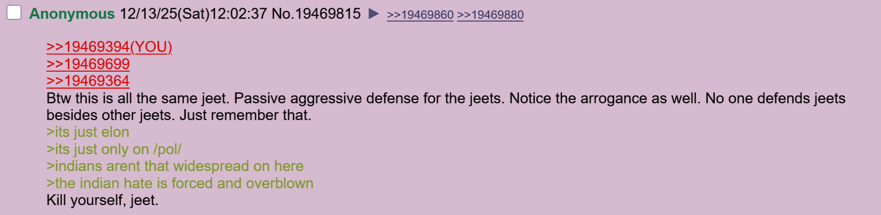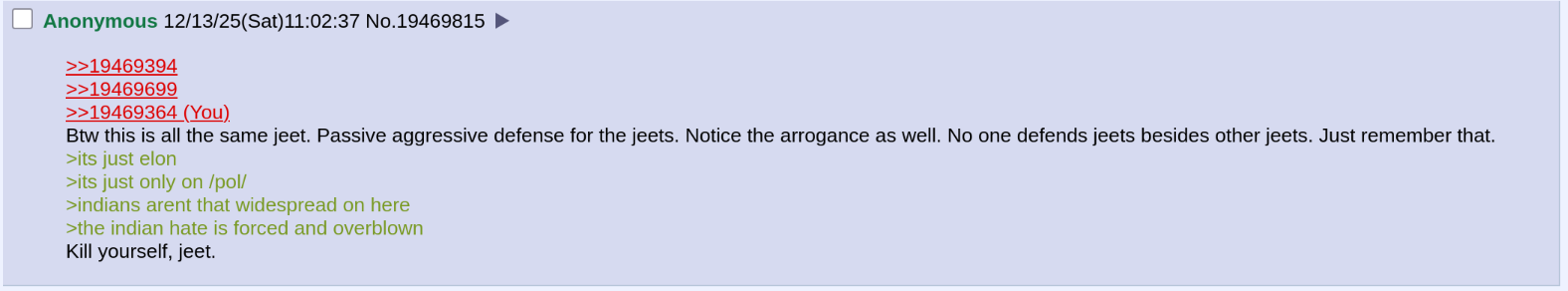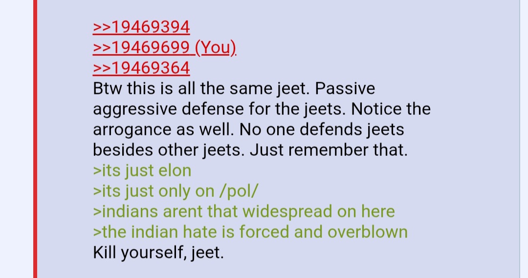 >>19469394>>19469699>>19469364Btw this is all the same jeet. Passive aggressive defense for the jeets. Notice the arrogance as well. No one defends jeets besides other jeets. Just remember that. >its just elon>its just only on /pol/>indians arent that widespread on here>the indian hate is forced and overblownKill yourself, jeet.