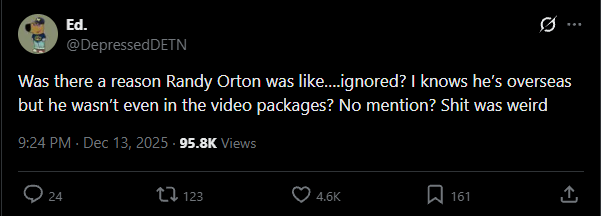 >>19484744>Orton is livid with WWEBecause they gave him comedy bookings with Joe Hendry and Jelly Roll? I’d be pissed off too if I were him.