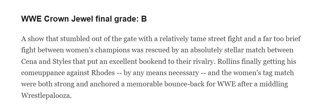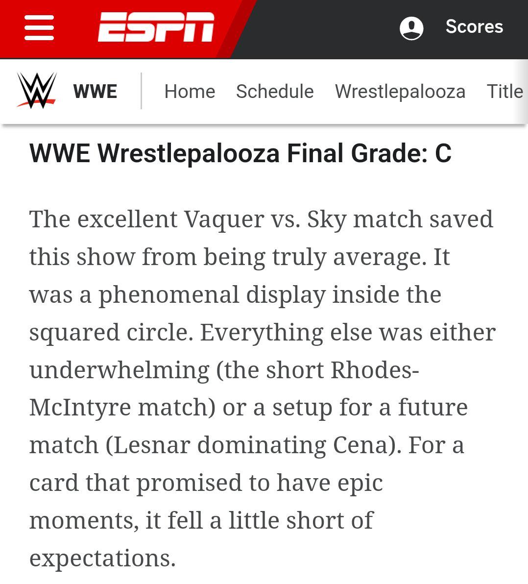 >>19491767ESPN did publish a review of Wrestlepalooza and gave it a relatively lukewarm grade. They haven’t made that a regular WWE event review series - so there simply haven’t been other reviews posted afterward.That doesn’t mean they’re thin‑skinned - it just isn’t part of their normal editorial routine like a wrestling‑specific site would do.If you’re looking for more regular analysis or reviews of WWE events from dedicated wrestling media outlets, there are plenty (411mania, Cageside Seats, Pro Wrestling Dot Net, etc.) - I can pull examples if you want!