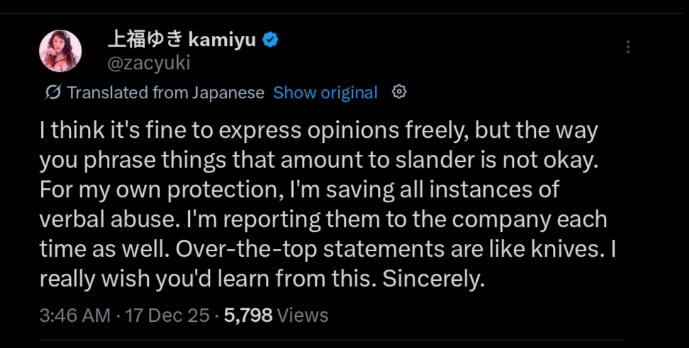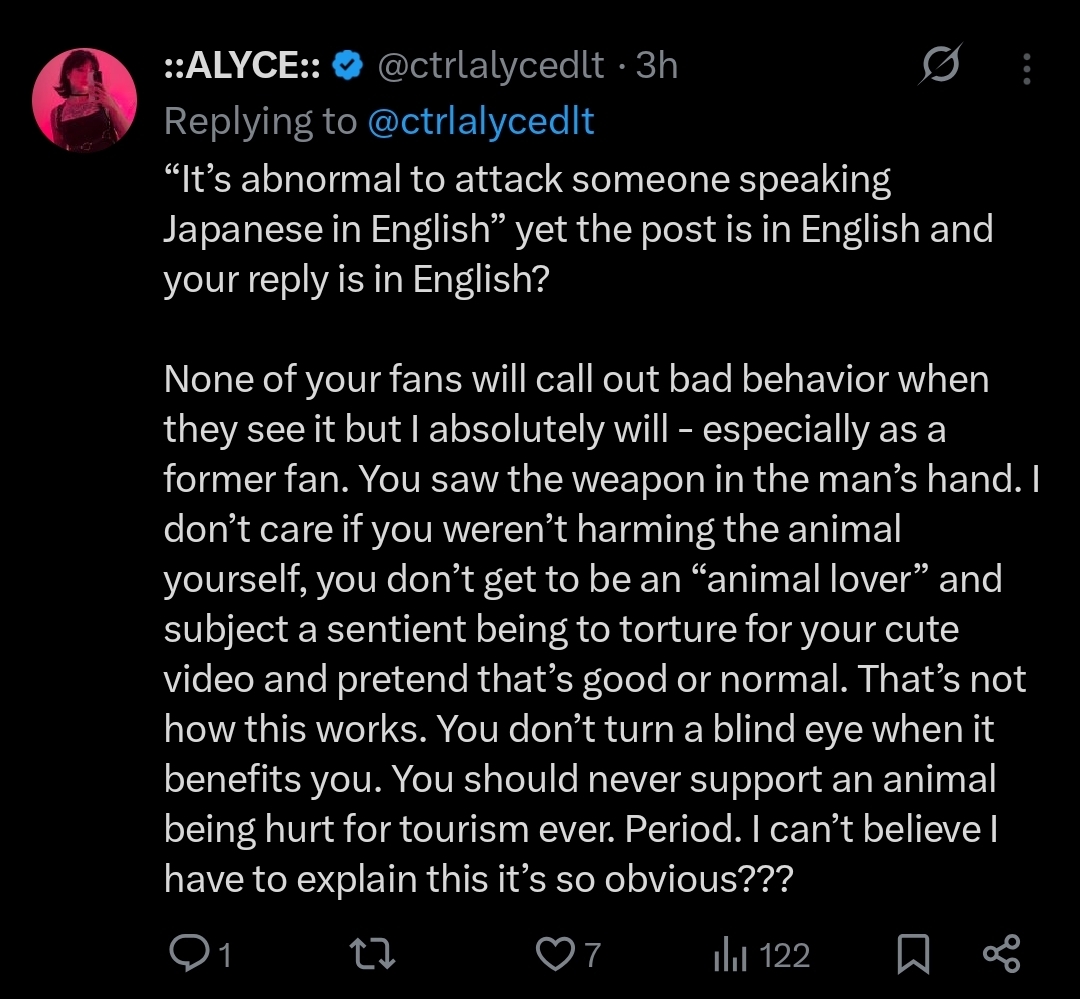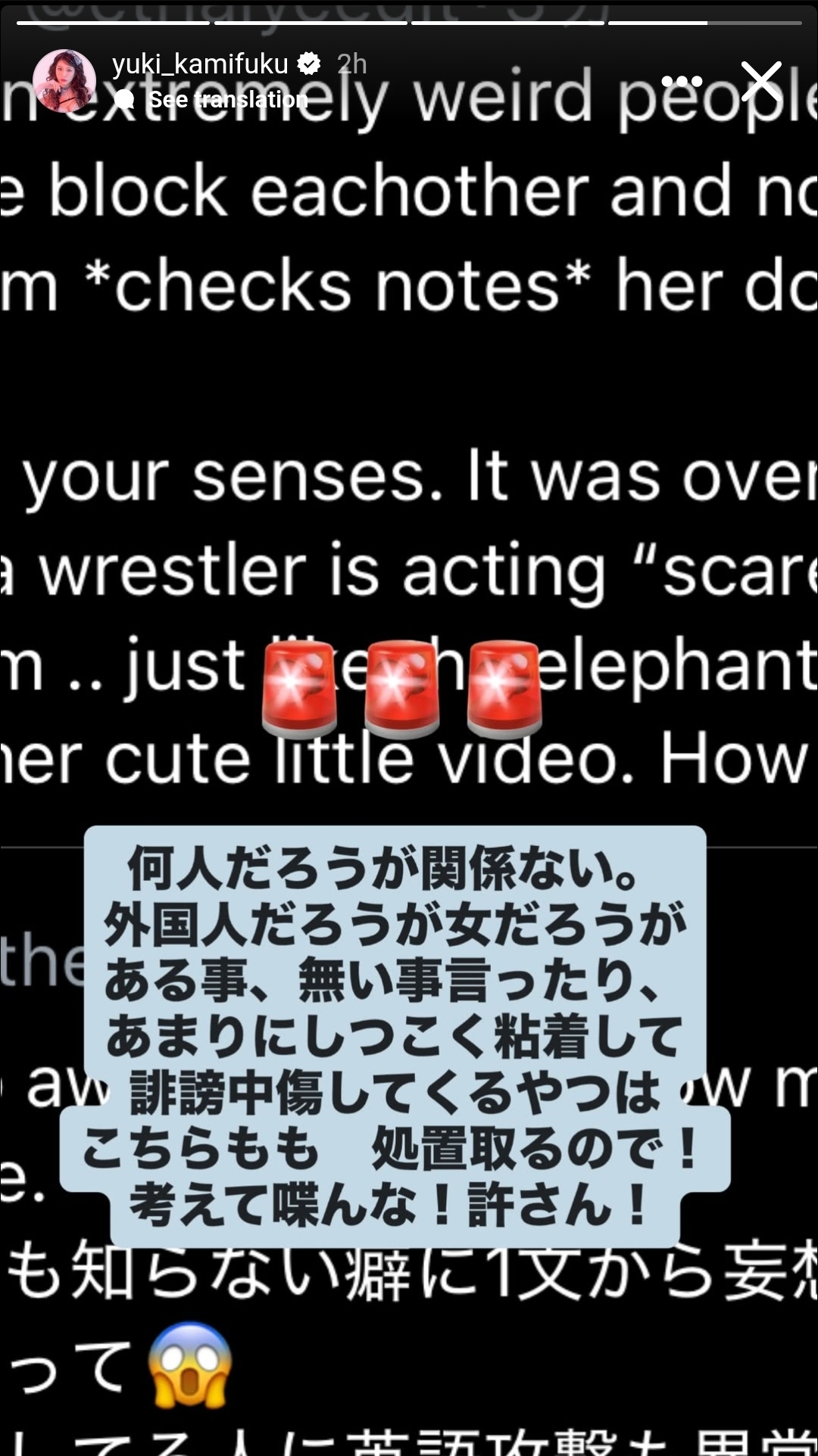 >>19503959Someone pissed off about the elephant video>It doesn't matter who you are. >Whether you're a foreigner or a woman, >if you keep spreading true or false rumors, obsessively stalking and harassing me with slander and insults, >I'll take action against you too! >Think before you speak! >I won't forgive you!