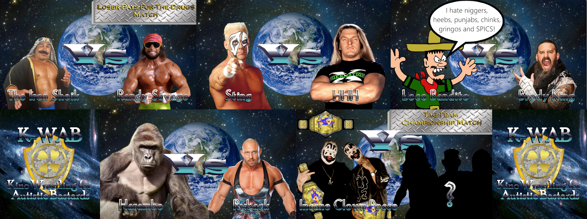 Now let's take a look at the card for Saturday. It includes:>Randy "Macho Man" Savage Vs The Iron Sheik in a special "loser-pays-for-the-drugs" match>Sting Vs HHH>Loco Bandito Vs Brody King>Ryback Vs Harambe>ICP Vs A Mystery Team for the K-WAB Tag Team Championships