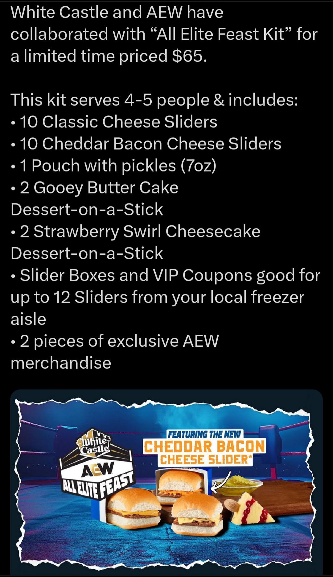 >>19513577>still trying to use the fast food analogyIf WWE is the McDonald's of wrestling than AEW is the White Castle of wrestling. Literally.