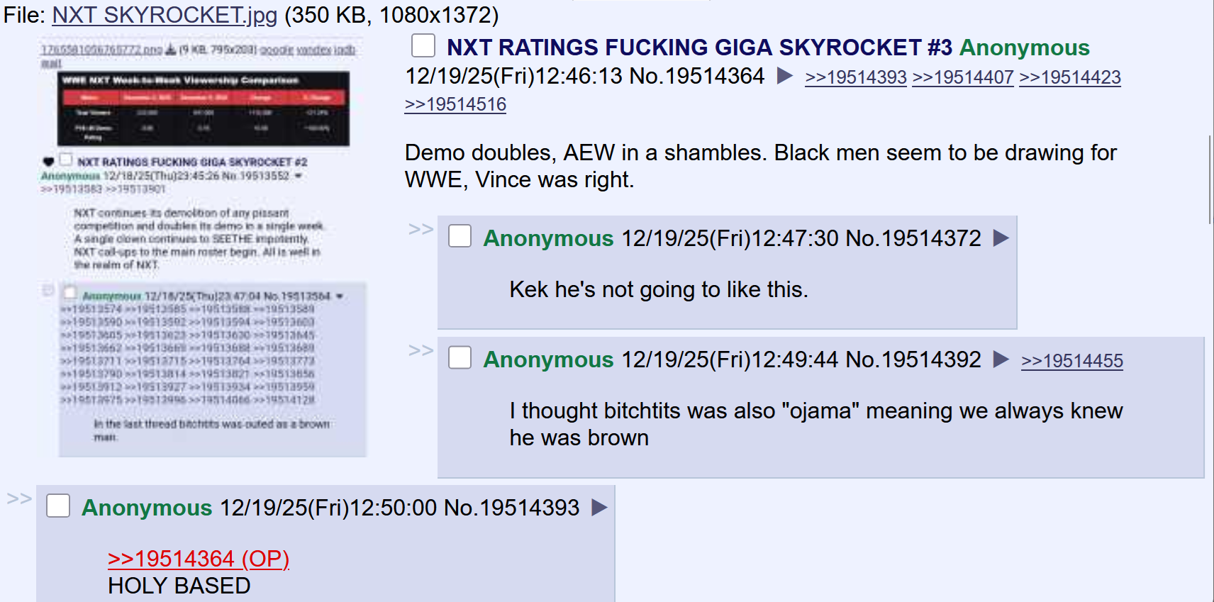 NXT demolishes any and all pissant competition and doubles its demo in a single week. NXT call-ups are more over than any pissant fed "main eventers." A single clown continues to SEETHE impotently and samefag. NXT keeps winning in every conceivable metric. YOU LOVE TO SEE IT.