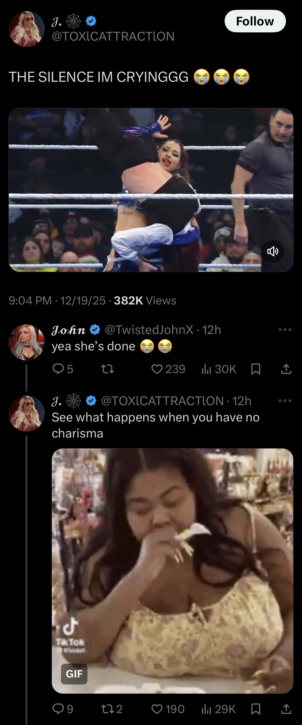 These diva stan accounts are mostly run by women and gay men, right? I can't fathom the idea of a straight man caring so much about women's wrestling that he'd have a pfp of a female wrestler, let alone talk like that.