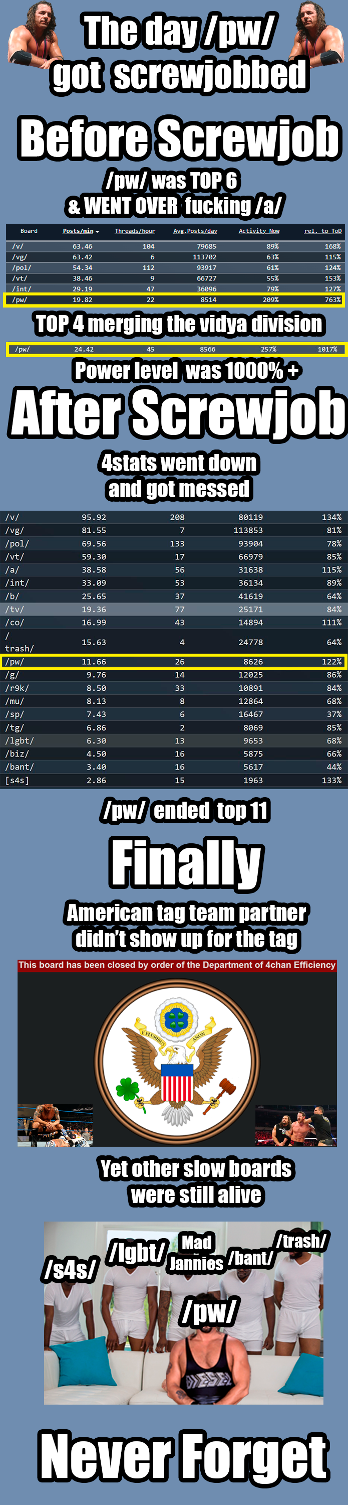 Is /pw/ actually KWABOTY?>Jobs to the Shart and misses Wrestlemania>Mods let the BT vs TW feud run wild>Jobs to the feud>Mods Pearl Harbor /pw/ with word filters>Jobs to word filters>Captcha changes>Jobs to highlighted letters and semi circles>Console Wars, Hogantrannyism, and Boogeymanning are still going over the territory