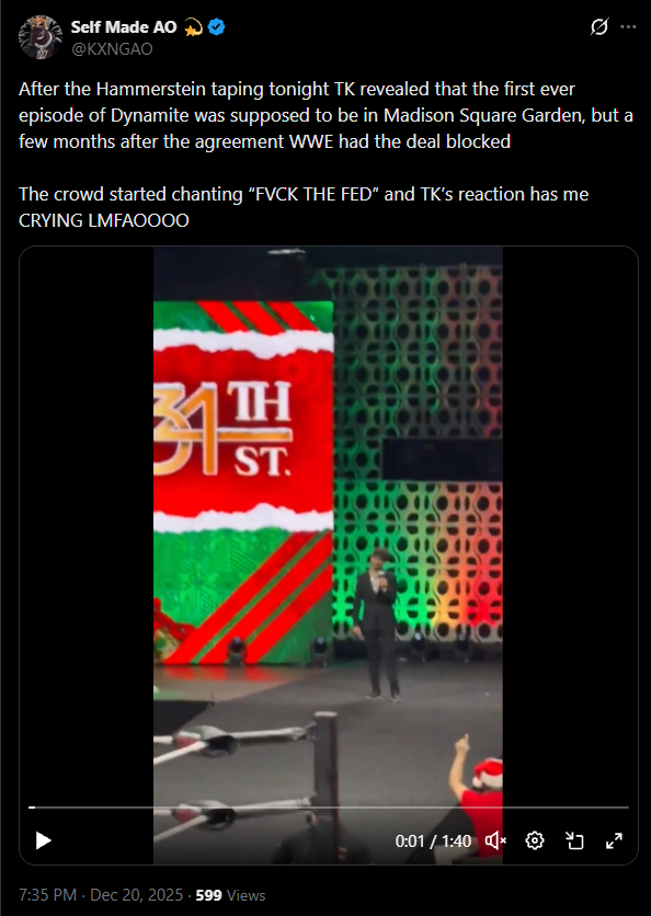 WWE doesn't have an exclusive deal with MSG anymore. ROH and NJPW ran MSG like 10 years ago. WWE typically tapes at Barclays Center now, not MSG. If AEW couldn't debut Dynamite at MSG, it's because they didn't think they could move tickets, or because MSG declined. Tony's just trying to reimagine AEW's failures as "Fed Bad" nonsense.