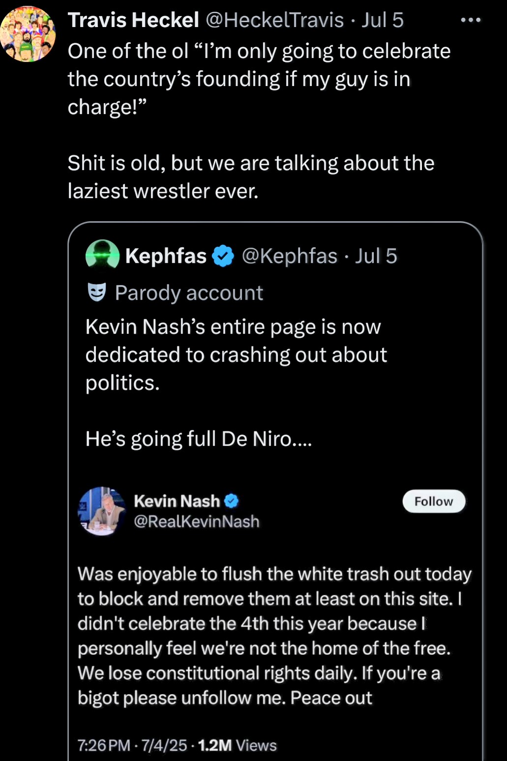 This man got raped in 1992. Never complained, never pointed fingers, just took it like a man, he learned how to like it, i'll be damned if i won't respect his choices and support them, let Kevin R Nash be happy, let him enjoy his time on earth, for we all know things have never been the same since that hot summer night 33 years ago