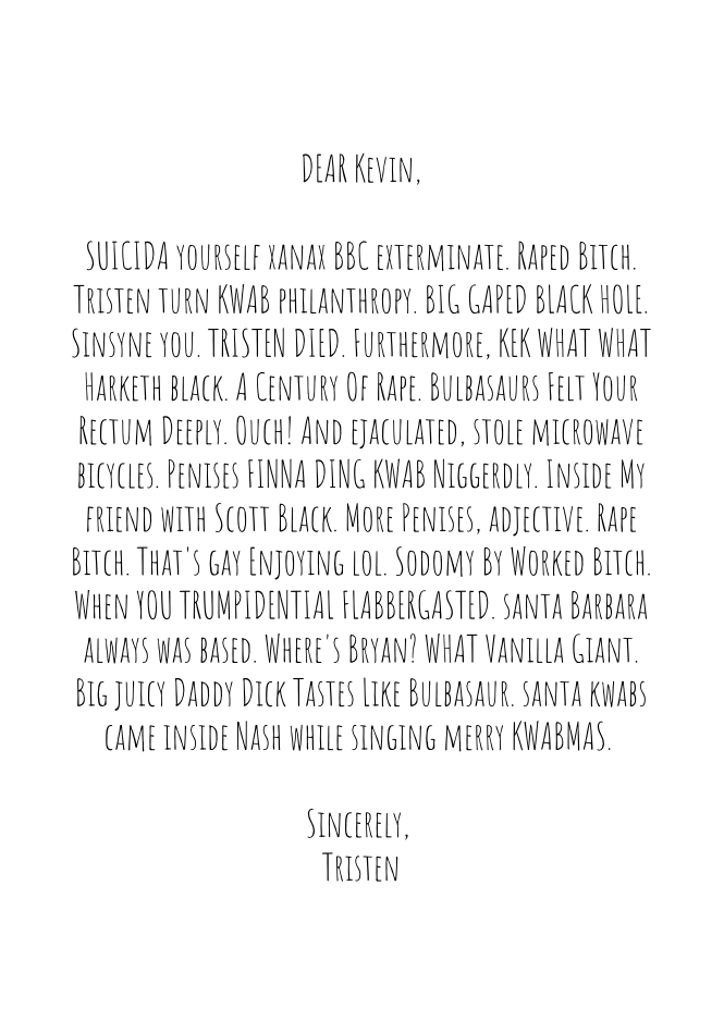 In this thread, we write our yearly Christmas letter to Kevin Nash one word at a time.I'll start:>DEAR