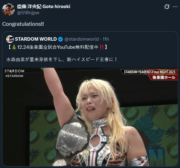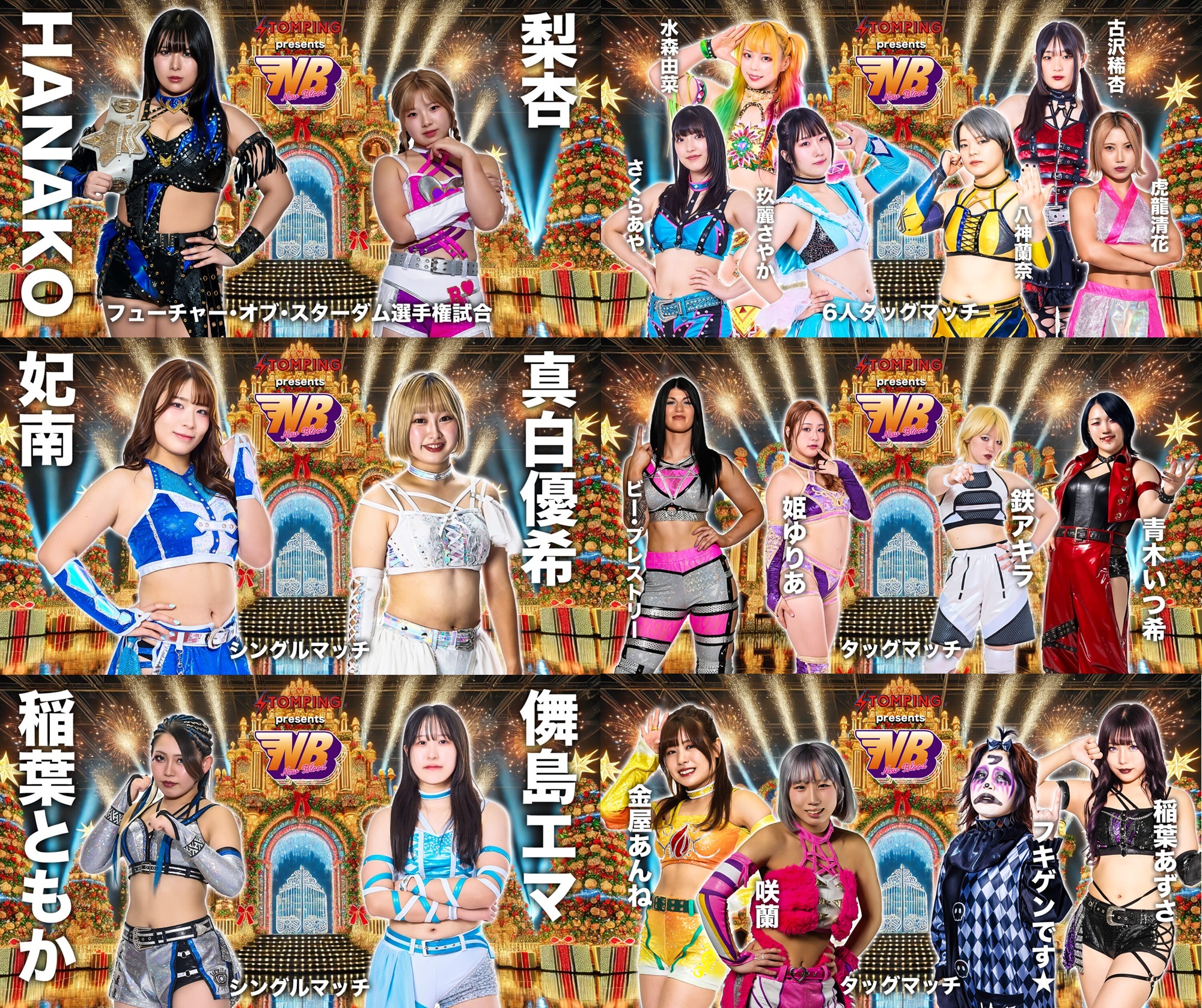December 25th, "NEW BLOOD 27 X'mas NIGHT", Bellesalle Shibuya First, Tokyo, 6:30PM JST (LIVE/YT)>Saran (WAVE) & Anne Kanaya (-) vs Azusa Inaba & Fukigen Death (H.A.T.E.)>Tomoka Inaba (JTO/God's Eye) vs Ema Maishima (-)>Bea Priestley & Yuria Hime (STARS) vs Itsuki Aoki & Akira Kurogane (Mi Vida Loca)>Hina (God's Eye) vs Yuki Mashiro (Freelance)>Yuna Mizumori, Aya Sakura & Sayaka Kurara (COSMIC ANGELS) vs Ranna Yagami & Kiyoka Kotatsu (God's Eye) & Kikyo Furusawa>Future of Stardom Championship: HANAKO (c) (E neXus V) vs Rian (E neXus V)December 26th, [Sendai Girls Pro Wrestling] "Sendai PIT Tournament", Sendai PIT, Miyagi, 7:00PM JST (VOD)>Ema Maishima (STARDOM) vs YUNA (Sendai Girls)>Chi Chi (EVO) & Hazuki (STARDOM) vs Mika Iwata & Miyuki Takase (Sendai Girls/Red Energy)>Rest of card: https://sendaigirls.jp/schedule/20251226/Previous >>19543856