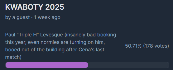 >>19562345Is it too late to change our votes for KWABOTY?I usually vote for Tony Kwab. He deserves it most years. But Triple Bypass spent nearly his entire career playing politics so he would one day get into the position he is in, up to and including marrying the boss' daughter. And if this is how it ends, he absolutely deserves KWABOTY.This also means that Vinny Mac had the last laugh after all.