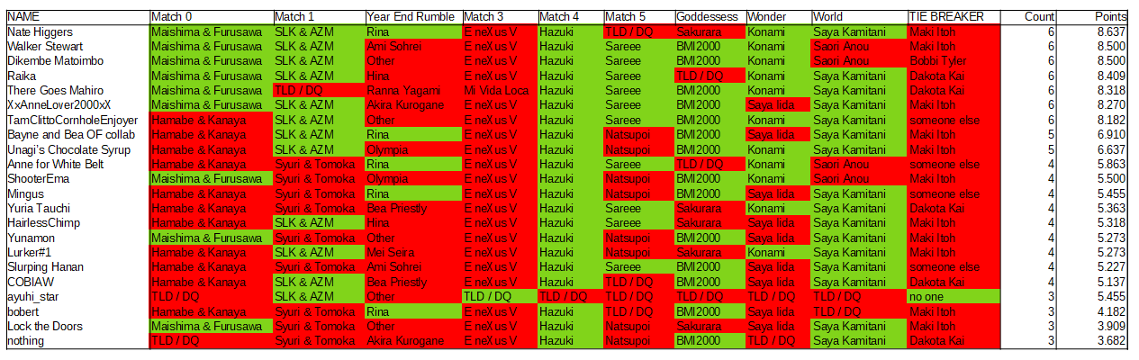 Results of the Dream Queendom survey. Some old names, some new.Originally I wasn't going to do the points ratio thing that the original poster would do, but seven people all got six correct guesses so I had to figure it out and add everything up.So, as a result of being the only one to guess that Rina would win the rumble out of those six, Nate Higgers gets first place.