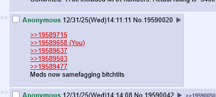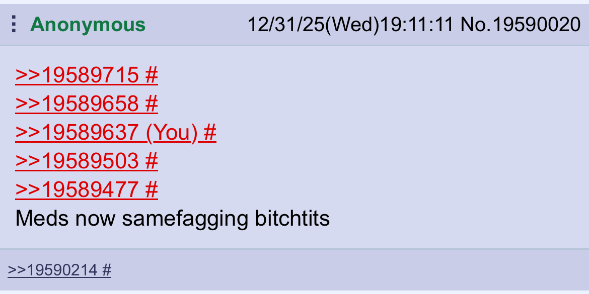 >>19589715>>19589658>>19589637>>19589503>>19589477Meds now samefagging bitchtits
