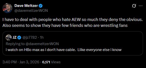 >no ratings for last week>no ratings for this weekTony's fighting tooth and nail to keep the ratings hidden because it's January now and the moment they get out everyone sees 500k on Max was a complete lie. Not only will this humiliate him and AEW, it'll expose Blowjob Bethel and destroy what's left of Meltzer's credibility.