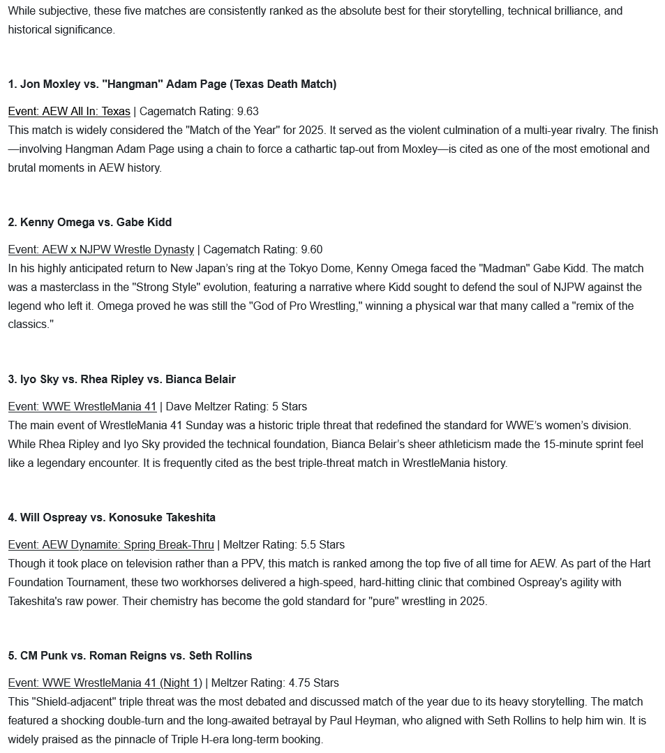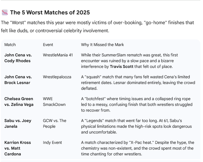 No because a lot of "worst" match lists just end up being matches that fans got worked into a seethe over and didn't get what they wanted out of. Regardless of the actual quality or wrestling in the match itself. The actual worst matches of the year aren't happening in any television promotion