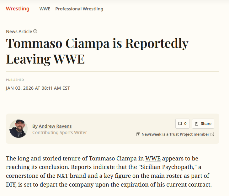 ONE OF PAUL'S BLACK & GOLD BOYS IS LEAVING THE COMPANYhttps://www.newsweek.com/sports/wrestling/tommaso-ciampa-is-reportedly-leaving-wwe-11301780>The long and storied tenure of Tommaso Ciampa in WWE appears to be reaching its conclusion. Reports indicate that the "Sicilian Psychopath," a cornerstone of the NXT brand and a key figure on the main roster as part of DIY, is set to depart the company upon the expiration of his current contract.>Over the last two weeks, eagle-eyed fans have noticed a significant change in the presentation of Johnny Gargano. The "Rebel Heart" has been appearing on WWE television accompanied only by his wife, Candice LeRae, with his tag team partner notably absent.>This sudden shift has now been contextualized by a report from BodySlam.net. The report claims that Ciampa’s absence is indicative of his looming exit.