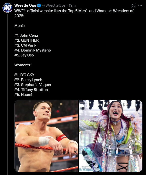WWE has officially named IYO SKY as the top women’s wrestler of 2025.The top 5: 1. IYO SKY2. Becky Lynch3. Stephanie Vaquer4. Tiffany Stratton5. Naomihttps://www.wwe.com/article/mark-kaboly-picks-his-top-5-wwe-women-superstars-of-the-year