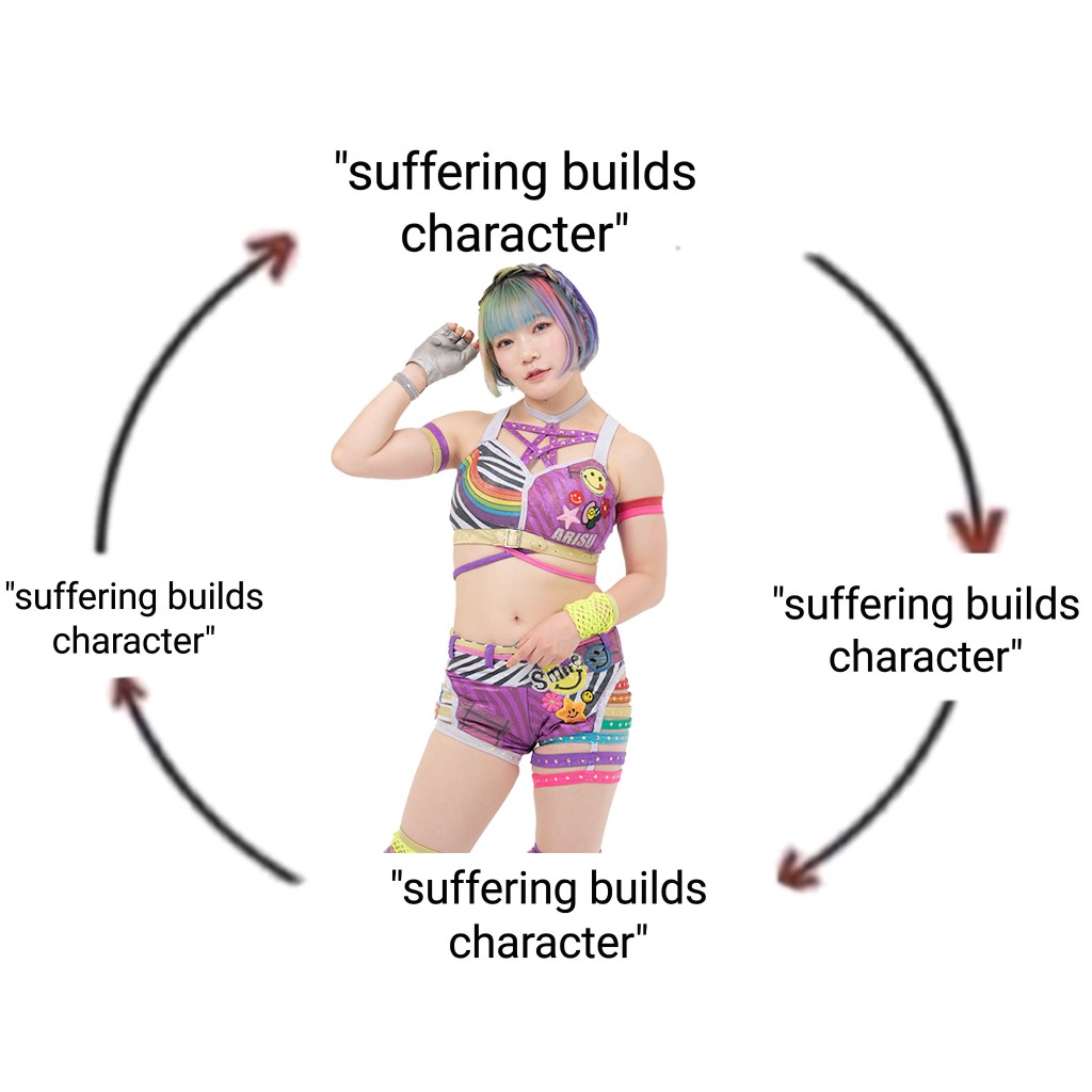 Hyper Misao having the stupidest most overlong least funny match in the history of the promotion full of dinosaur toys and horse shit walking backstage saying to Miyu Yamashita "Try following that, bitch"