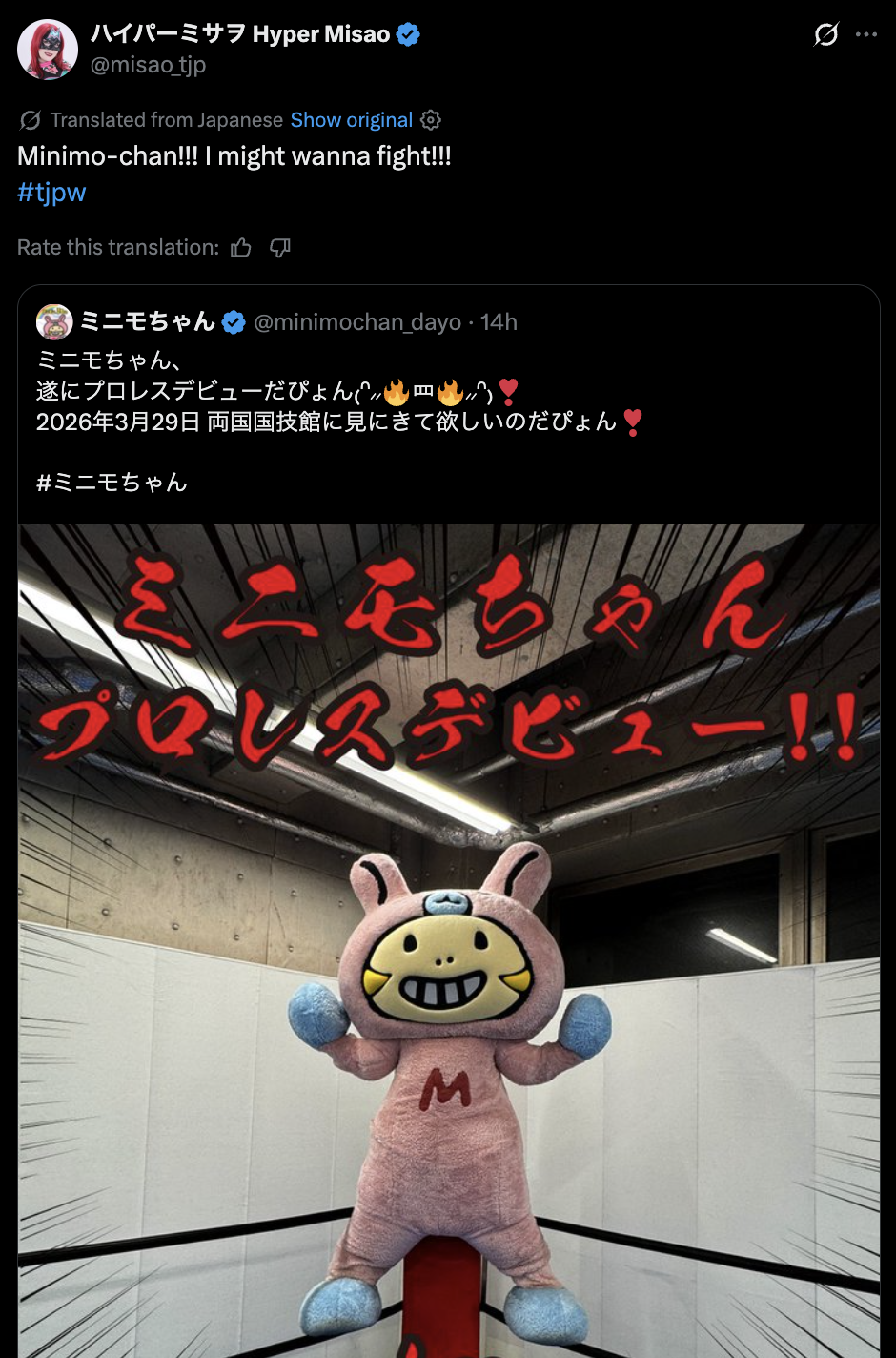 >>19619676Mirai is too big of a star to wrestle on small tjpw shows