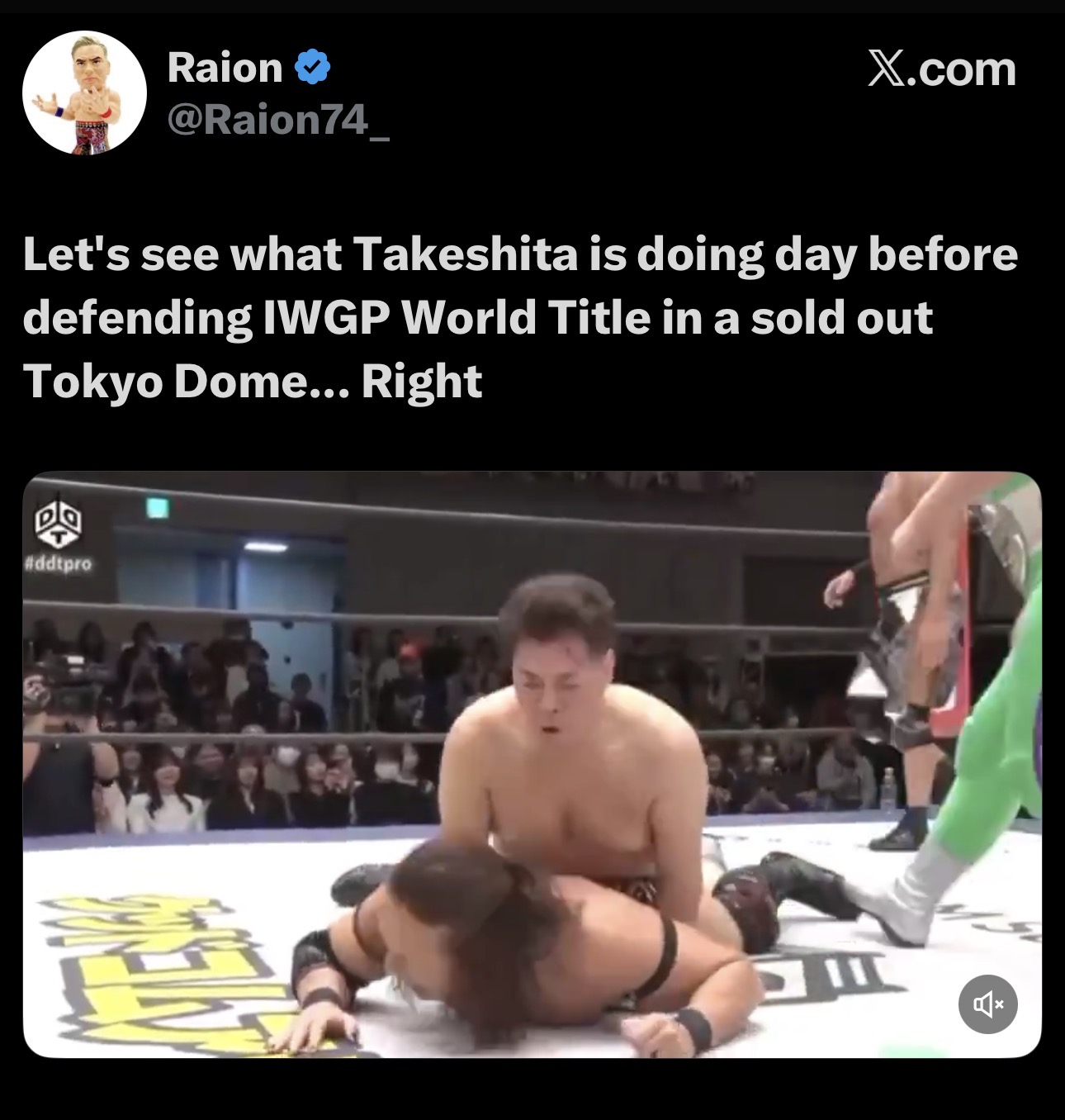 First off, I have no idea what that picture has to do with AEW. That's the venue during the preshow match between Chris Brookes and ELP and before either of them even came out.Secondly, a far more accurate assessment is to say that the crowd is completely indifferent to AEW.The biggest evidence of this was when Okada did his classic AEW spot of hyping up the Rainmaker Call and then giving the middle finger. The shock and fury was unbelievable and very funny. The reaction that shit got was the exact same as if it had been done for the first time. Less than 2% of the Japanese people in that venue have ever seen a single AEW Okada match.
