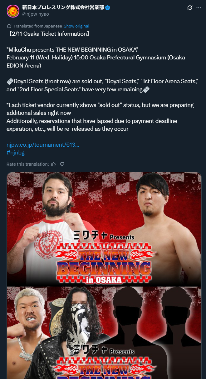 >>196339941/28 Ito Kougyou Arena Tsugaru (7:00pm)1/29 Iwate Prefectural Gymnasium (7:00pm)2/1 Korakuen (6:30pm)2/2 Korakuen (6:30pm)2/3 Iwaki City General Gymnasium (6:30pm)2/4 Fukushima Toyota Crown Arena (6:30pm)2/7 Takeda Ham Habikino Coliseum (4:00pm)2/8 EDION Arena Osaka 2nd Stadium (6:00pm)2/11 The New Beginning in Osaka @ EDION Arena (3:00pm)>IWGP Tag Team Championships: OSKAR & Yuto-Ice (c) vs Winners of the Jan 19th No. 1 Contender Match>NEVER Openweight Championship: Aaron Wolf vs Ren Narita