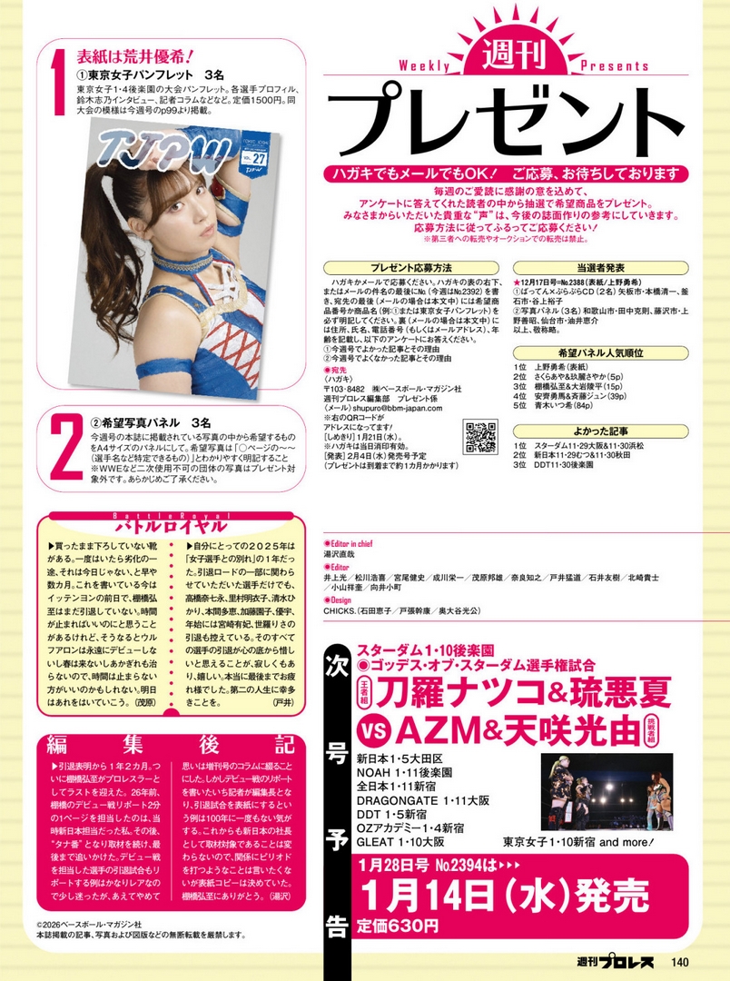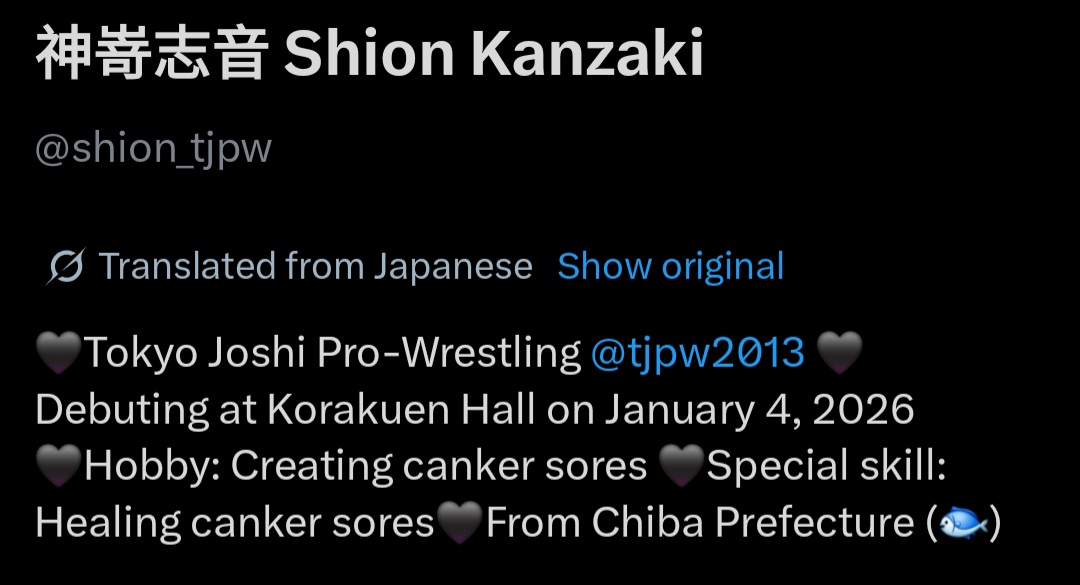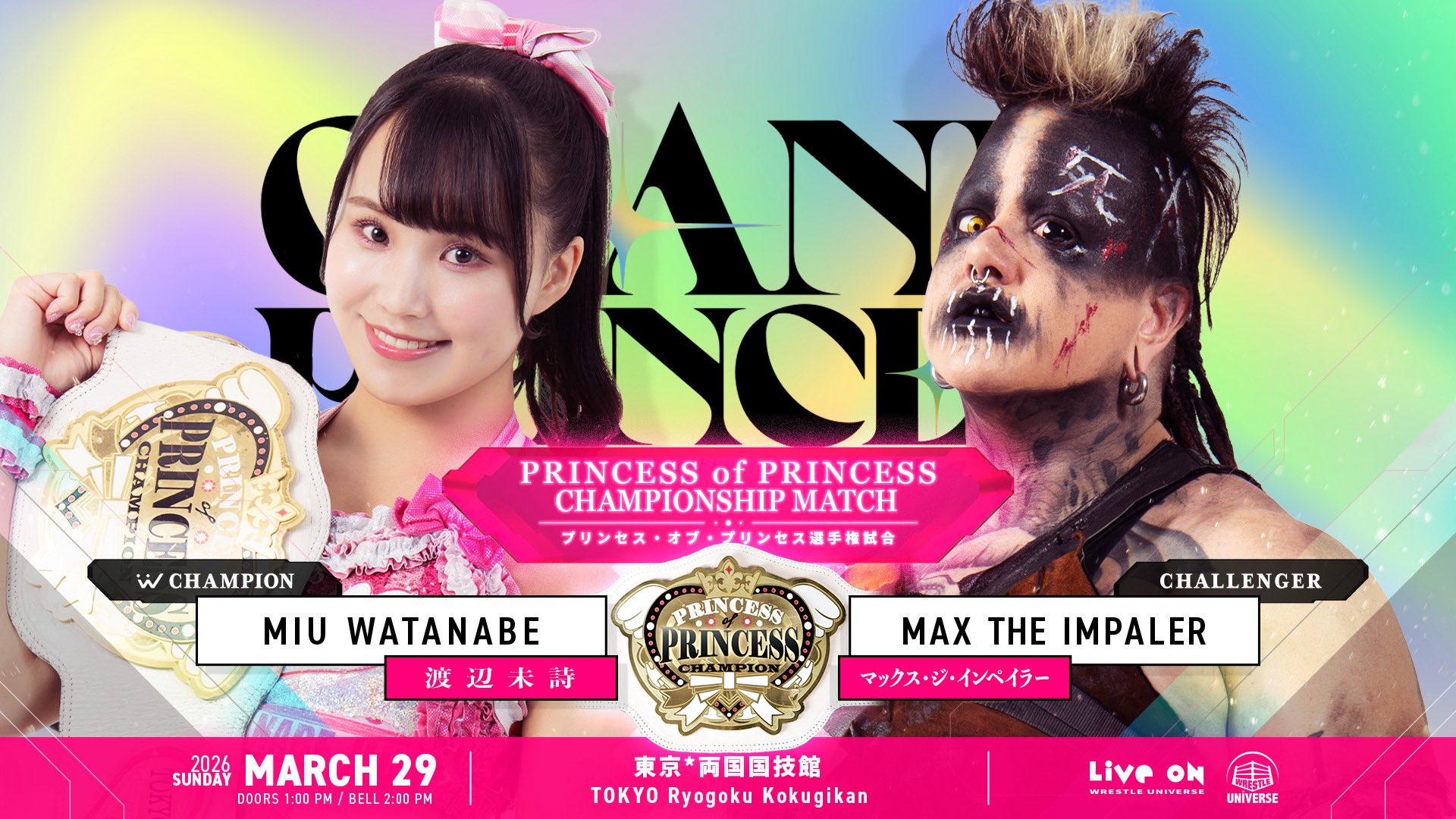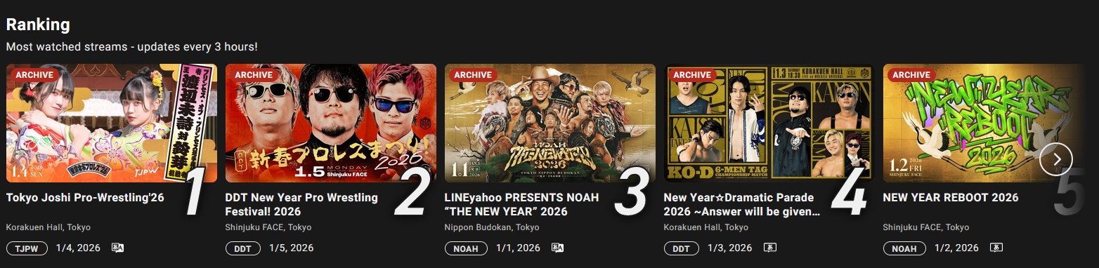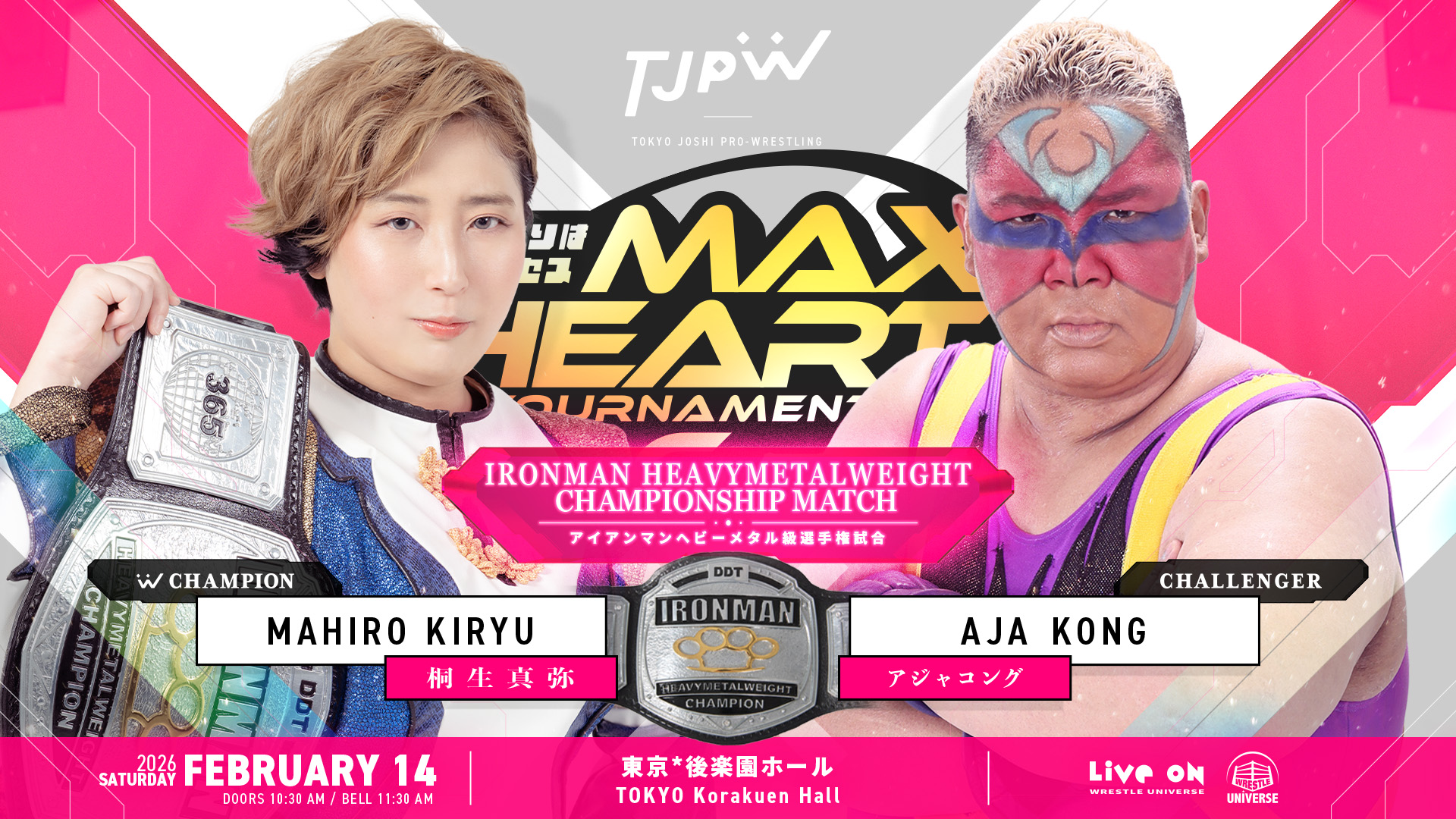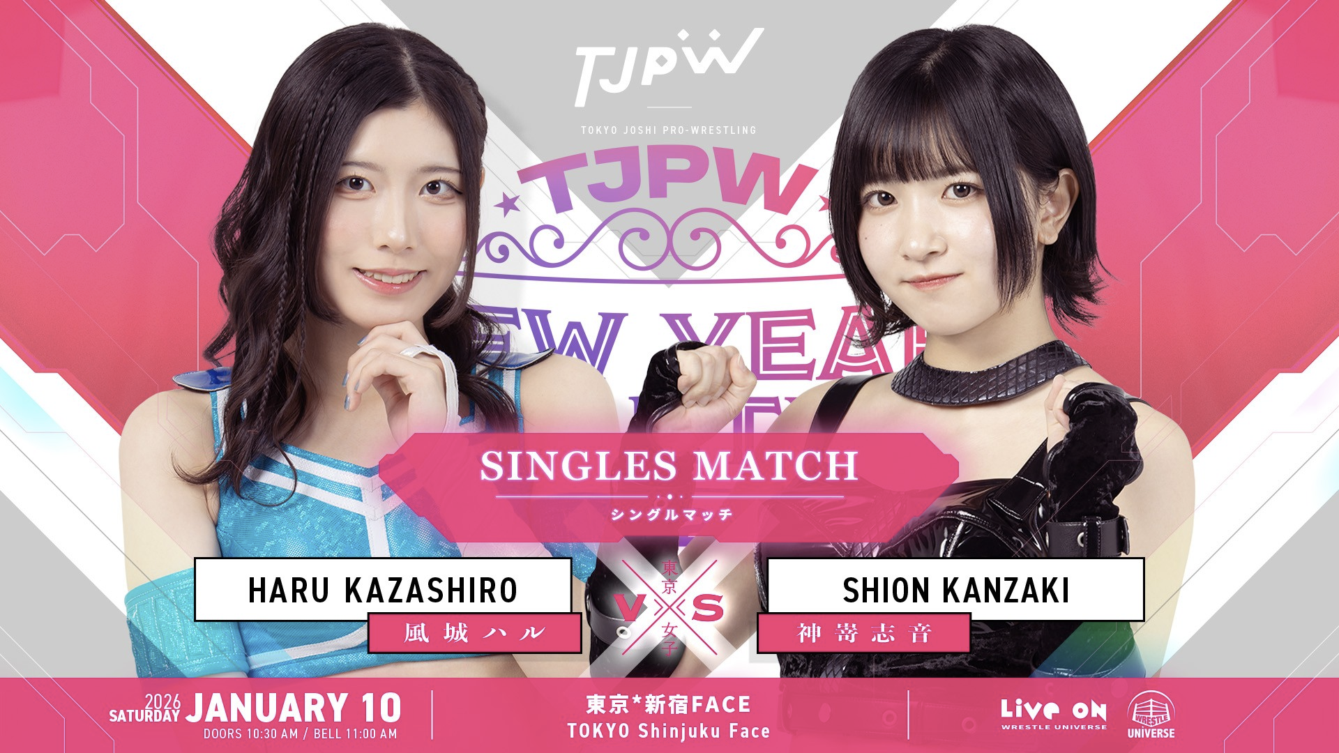 Watch on Wrestle Universe - 1,298 yen per month.https://www.wrestle-universe.com/enSchedule1.10 TJPW New-Year Party 2026 @ Shinjuku FACE, Tokyo (LIVE)[11:00 JST]1.17 The 6th "Futari wa Princess" Max Heart Tournament @ Yokohama Radiant Hall, Kanagawa (LIVE)[12:00 JST]1.25 The 6th "Futari wa Princess" Max Heart Tournament @ Ryogoku KFC Hall, Tokyo (LIVE)[16:00 JST]1.31 The 6th "Futari wa Princess" Max Heart Tournament @ Shinjuku FACE, Tokyo (LIVE)[11:00 JST]Previous>>19625599